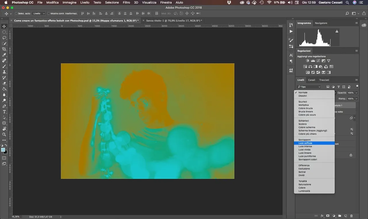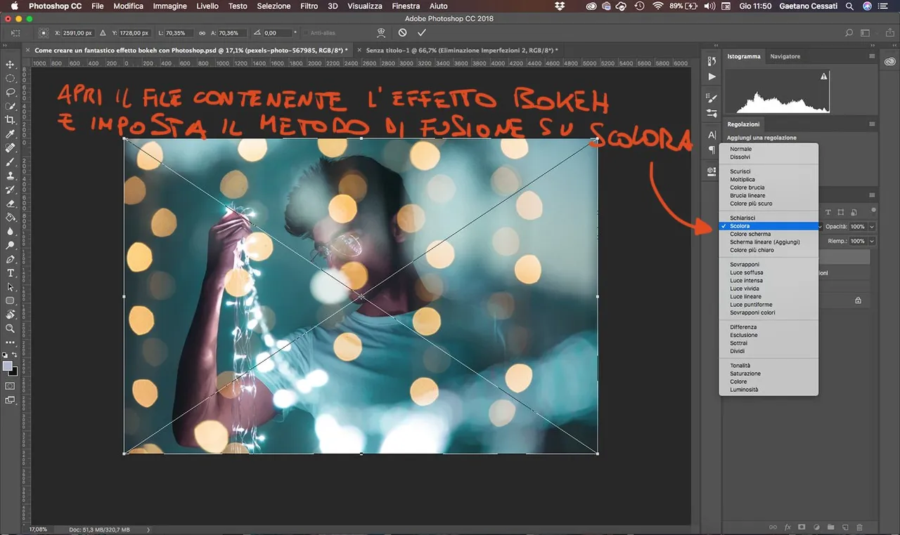 Adesso trascina l’immagine dei bokeh all’interno di Photoshop e assicurati che i bokeh stiano sopra il livello di Sfondo, quello dove c’è il soggetto. Cambia il metodo di fusione del livello da Normale a Scolora (Screen, per chi usa Photoshop in inglese).