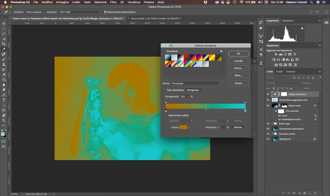 Apri la finestra di dialogo da menù LIVELLO > NUOVO LIVELLO DI REGOLAZIONE > MAPPA SFUMATURA e usa due colori presenti nella fotografia del soggetto e che possibilmente siano complementari. Prova e riprova, sperimenta, gioca con i colori finché non trovi una combinazione che ti soddisfi. Quindi imposta il metodo di fusione su “Luce soffusa” e ricordati che puoi sempre abbassare l’opacità del livello per ridurre l’effetto.
