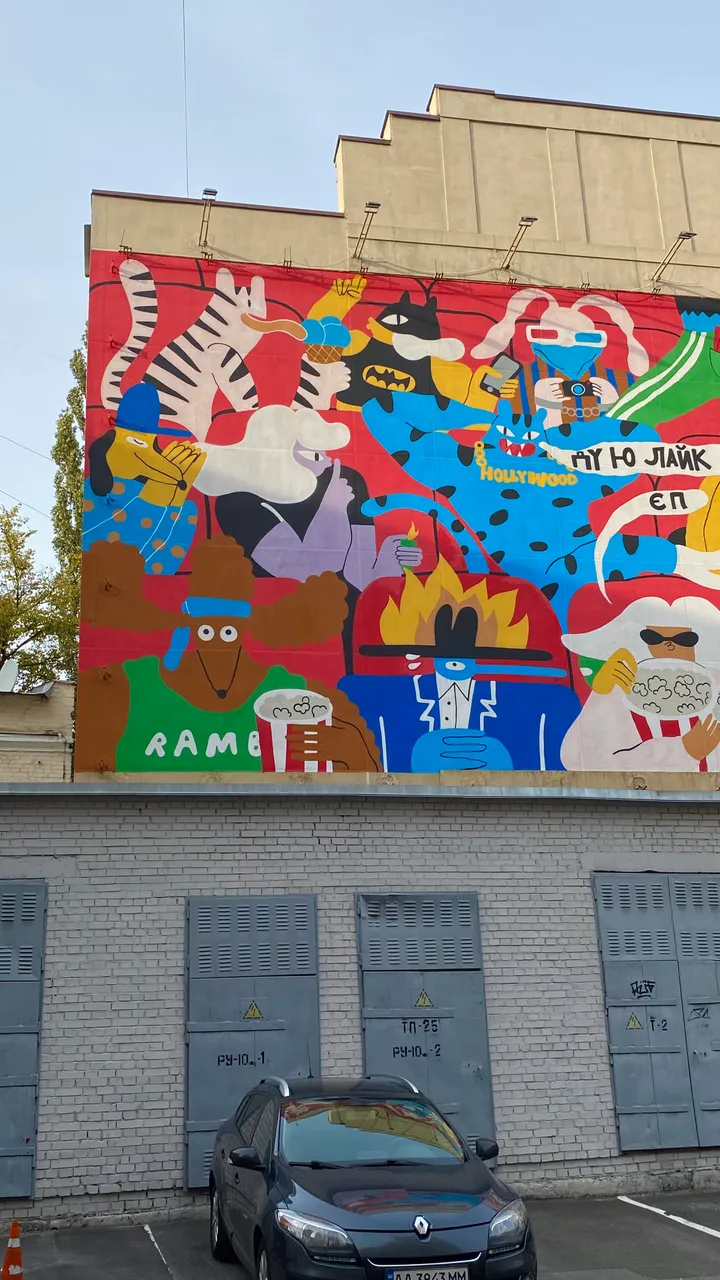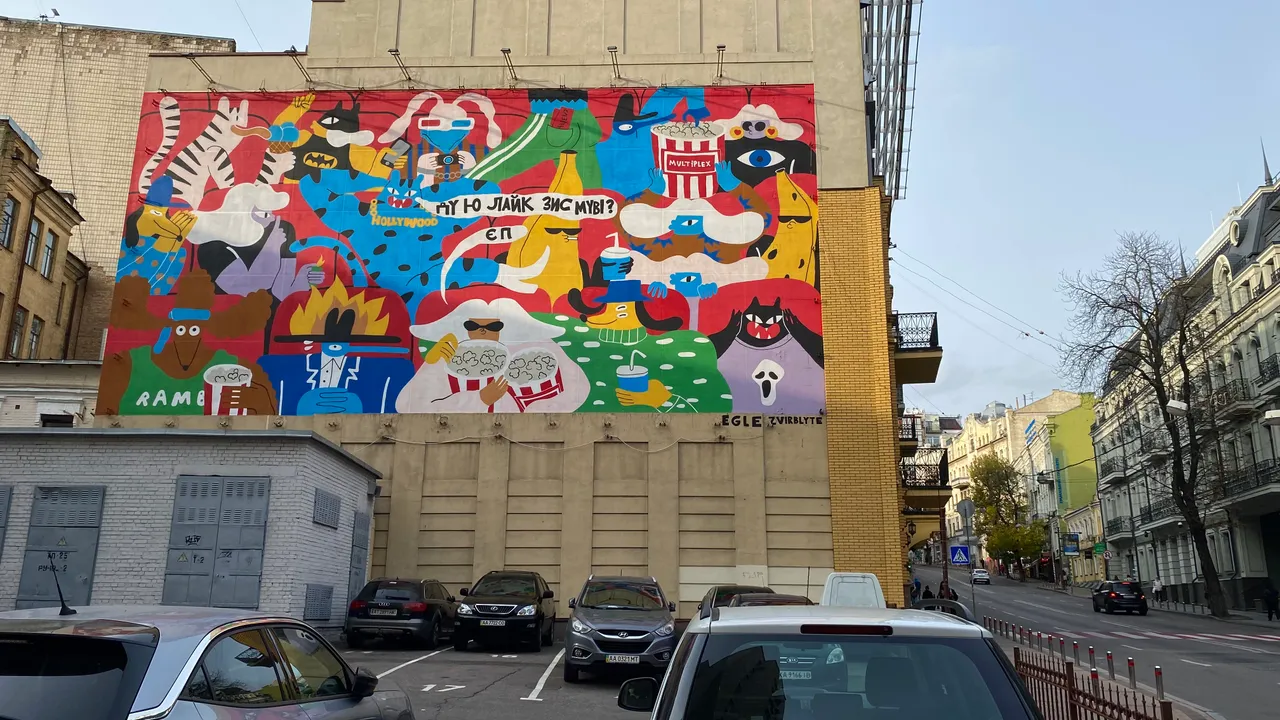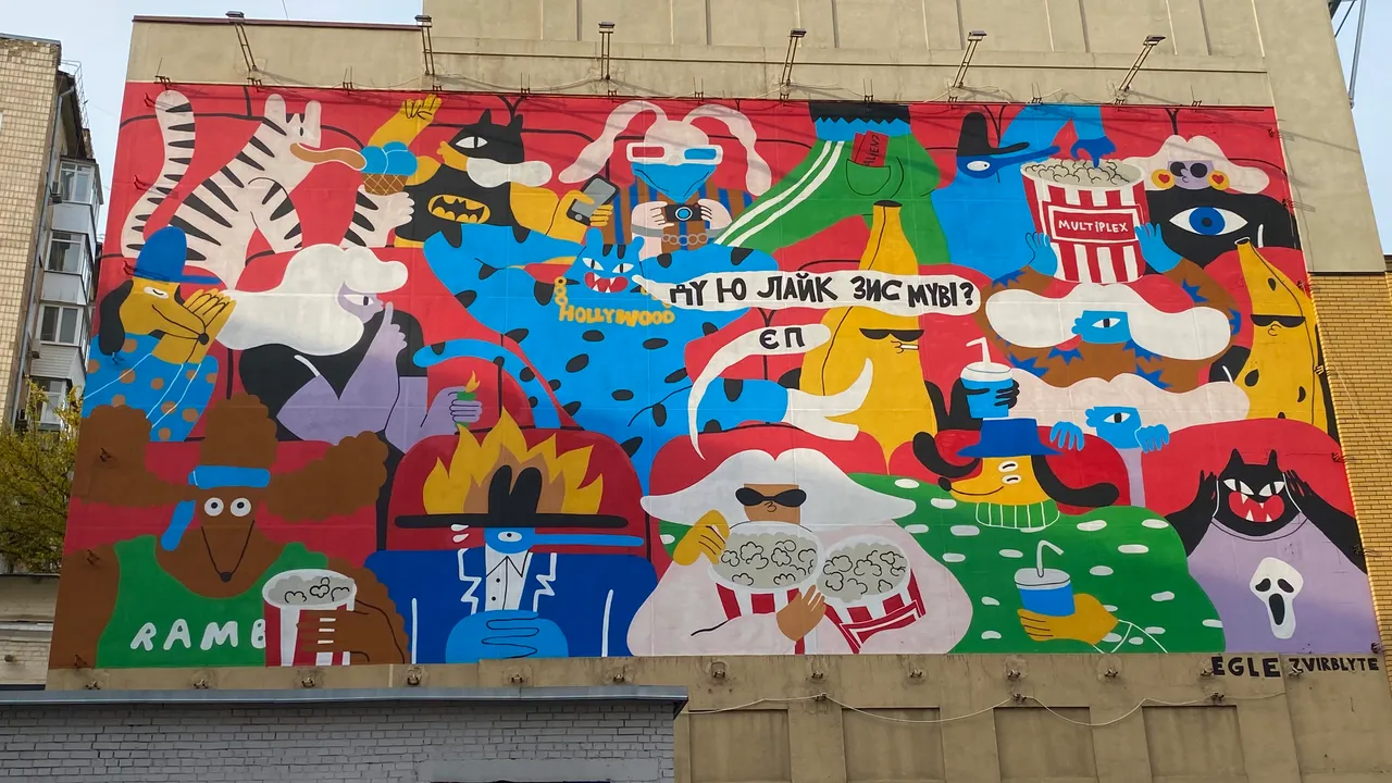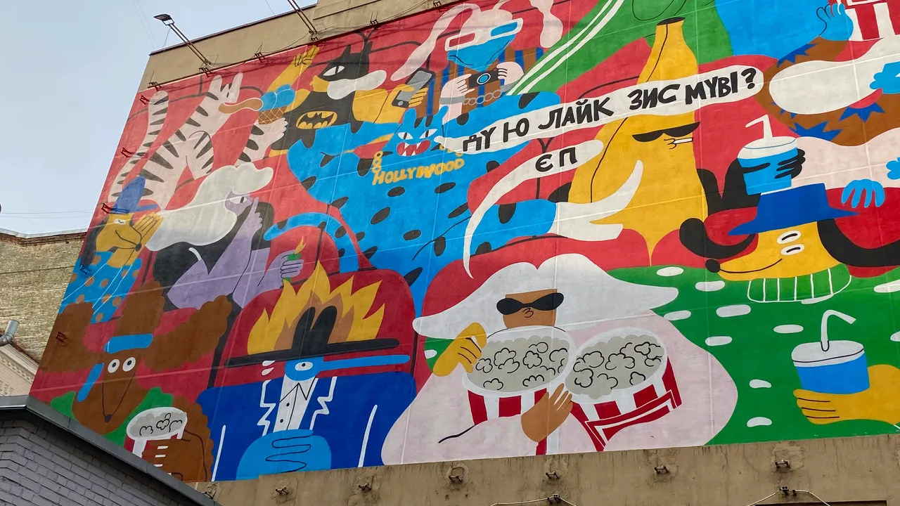 This street art appeared in Kyiv thanks to the artist's cooperation with Multiplex Cinemas. An English phrase is written in Cyrillic letters on the mural: "Do you like this movie? Yep". So, this artwork is about cinema.