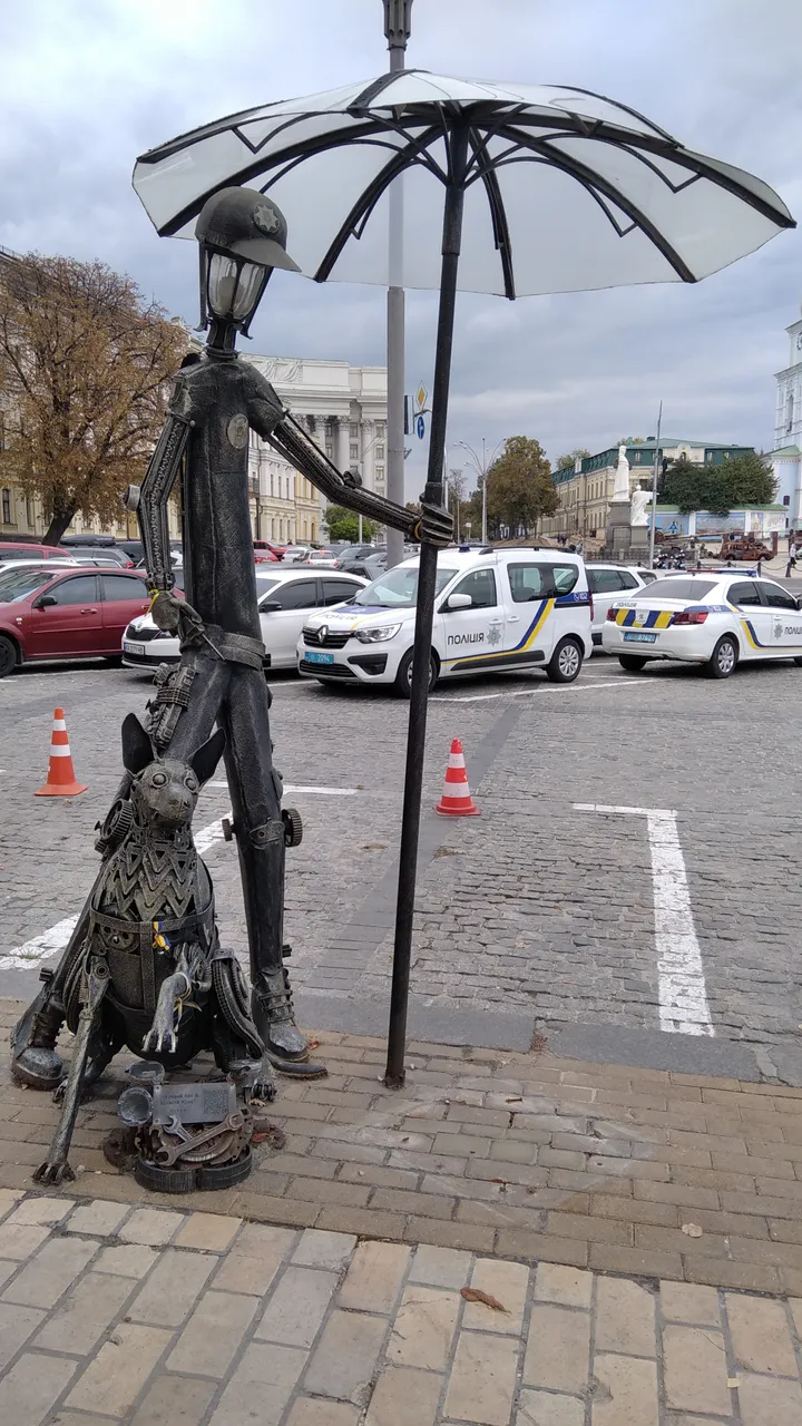 Іще один пес. Теж дуже милий. На захисті нашої безпеки. Від осіннього дощу так точно врятує під парасолькою, яку тримає його напарник-полісмен. "Сталевий коп & Вухаста Куля" (2019).