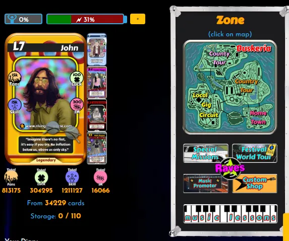 Do you know that we have Music NFTs here on HIVE Blockchain that not only gives you the pleasure to be proud owner of the NFTs [Non Fungible Tokens] but also at the same time provides the play to earn opportunity. The platform where you can enjoy all this stuff is none other than the Risingstargame. The game is built on HIVE Blockchain and is a browser-based music career simulator reminiscent of the old flash player glory days. New players start out as a lowly Busker trying to earn a living playing tunes wherever they can and complete different missions to earn STARBITS - so complete missions and you can easily earn some STARBITS tokens. I have been part of the game when it was initially launched and currently HODL close to 34K+ NFTs i.e. cards that provides different stats in terms of fans, luck, income and skill.
