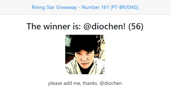 A duração do Giveaway será de 24 horas ou até eu postar o próximo giveaway de Rising Star, então fique de olho nas minhas postagens para que você não acabe publicando o comentário em um giveaway que já possui um ganhador.