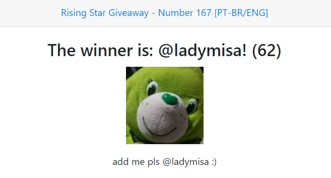 A duração do Giveaway será de 24 horas ou até eu postar o próximo giveaway de Rising Star, então fique de olho nas minhas postagens para que você não acabe publicando o comentário em um giveaway que já possui um ganhador.