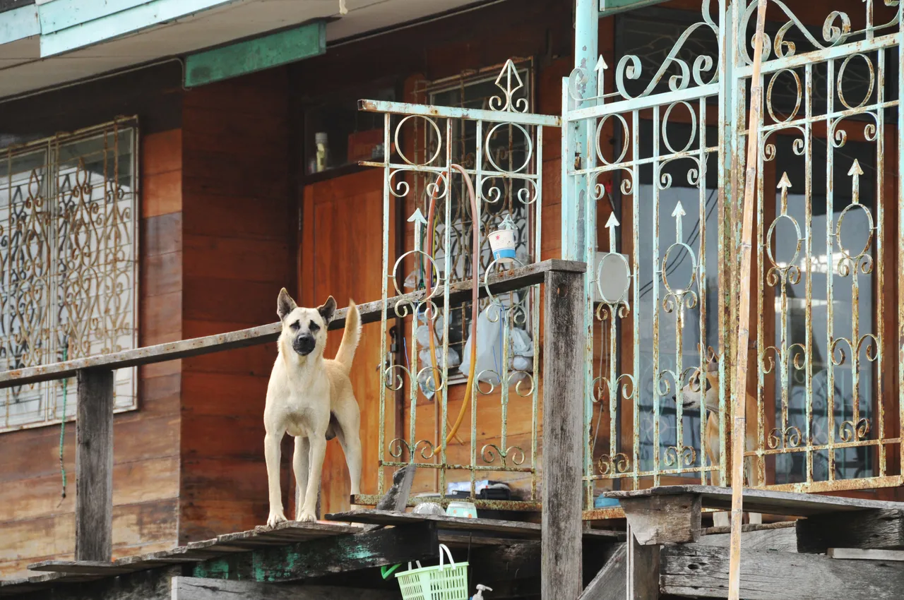 With the water itself being fairly featureless my eye was drawn to the buildings along the shores, and what a variety there were. There were a few warehouses and factories, some of them in a state of collapse, but it was the domestic homes that stood out. All of them quite small and stilted often with steps or a jetty down to the water, but the striking thing was that every single one of them was different. That makes such a difference. No ranks of identical houses built to be efficient. These were individual homes with individual character and an overall impression of community. This style makes it so aesthetically pleasing particularly when the homes are well tended with hanging plants and inquisitive dogs.
