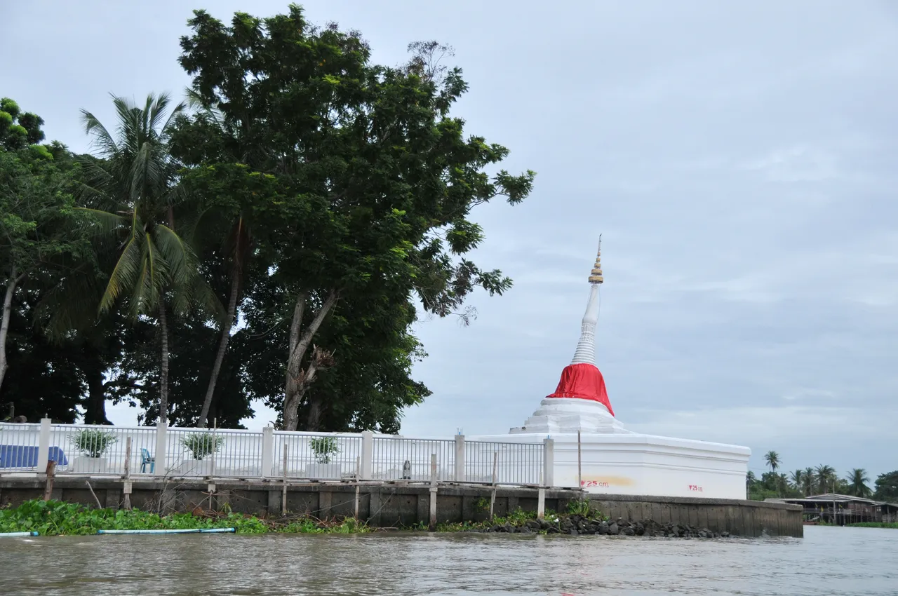 Sanam Nuea Temple is next to a regular ferry jetty for people going to and from the island. Knowing that getting into my kayak can be a bit awkward and feeling a little shy of the reaction I might receive I waited until the jetty was clear of people before launching. Appropriately, my starting point was directly opposite the landmark of the Leaning Pagoda of Poramai Yikawat Temple on the far shore that marks the corner where the river and canal split.