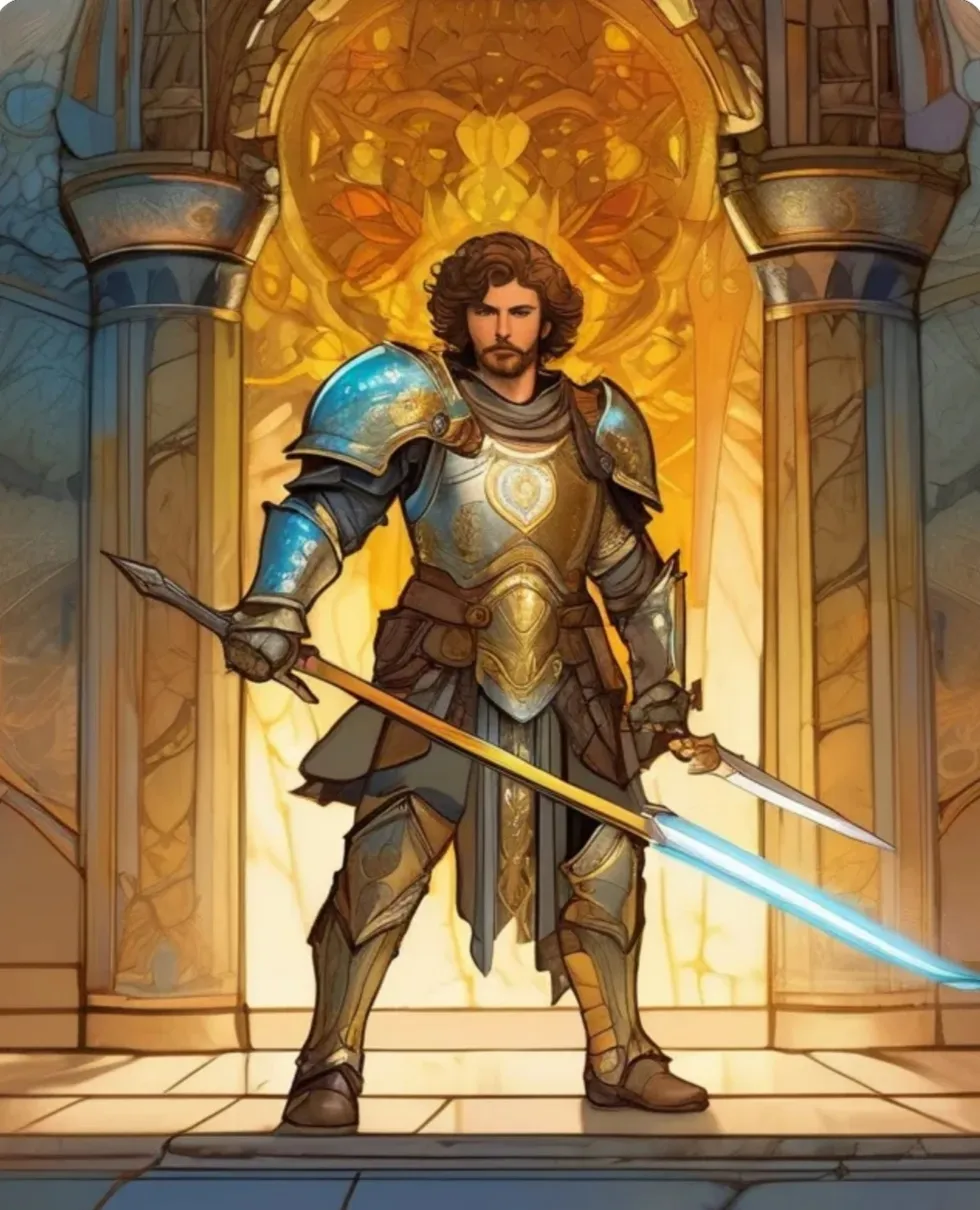 As a paladin, he embodies the virtues of justice, valor, and righteousness. His golden sword, held firmly in his hand, stands as a symbol of his unwavering dedication to defending the cosmic realms from darkness.