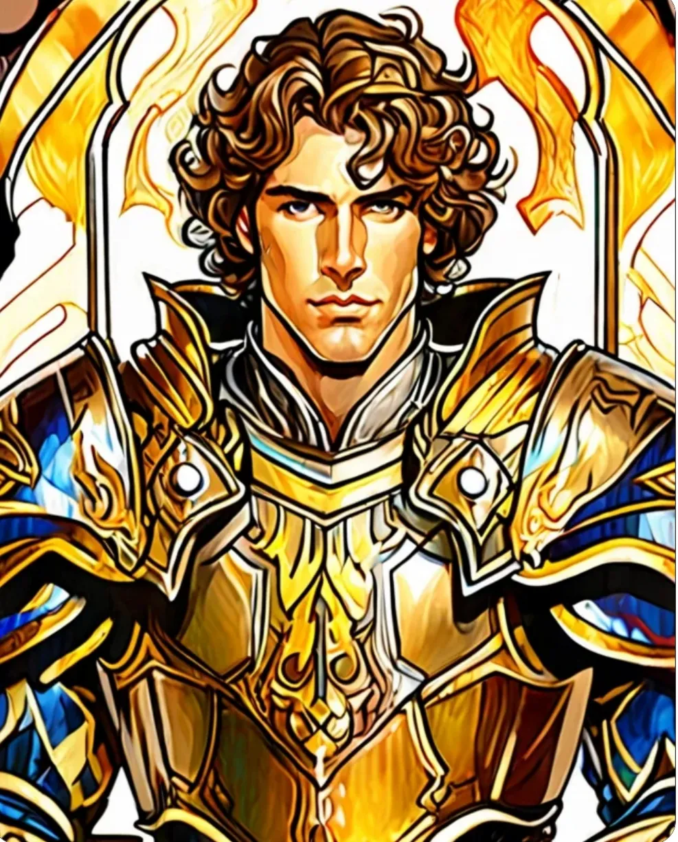 Handsome male paladin, heavy gold steel armor, golden, glowing sword, brown curly hair, handsome face, in a dungeon, detailed, realistic face, soft colors, hyperrealism, watercolor, electric colors, textured background, fantasy art, by alphonse mucha, comic art