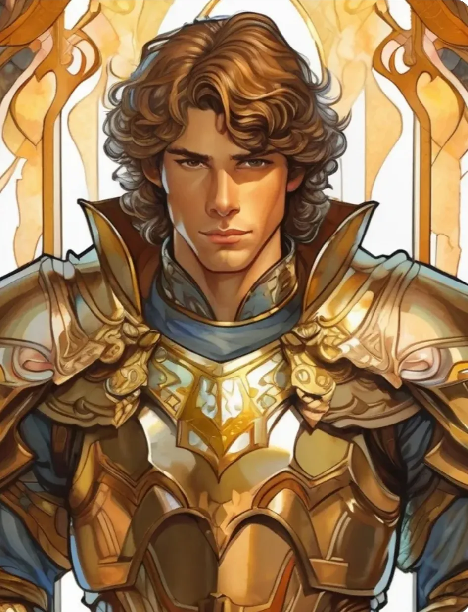 The Golden Handsome Male Paladin exudes a regal and powerful aura, with his golden armor shining brightly in the cosmic void. Each perfectly sculpted piece of armor adorns his body, reflecting both his strength and gallantry. The intricate designs of his armor shimmer and dance with mesmerizing cosmic patterns, making him a sight to behold.