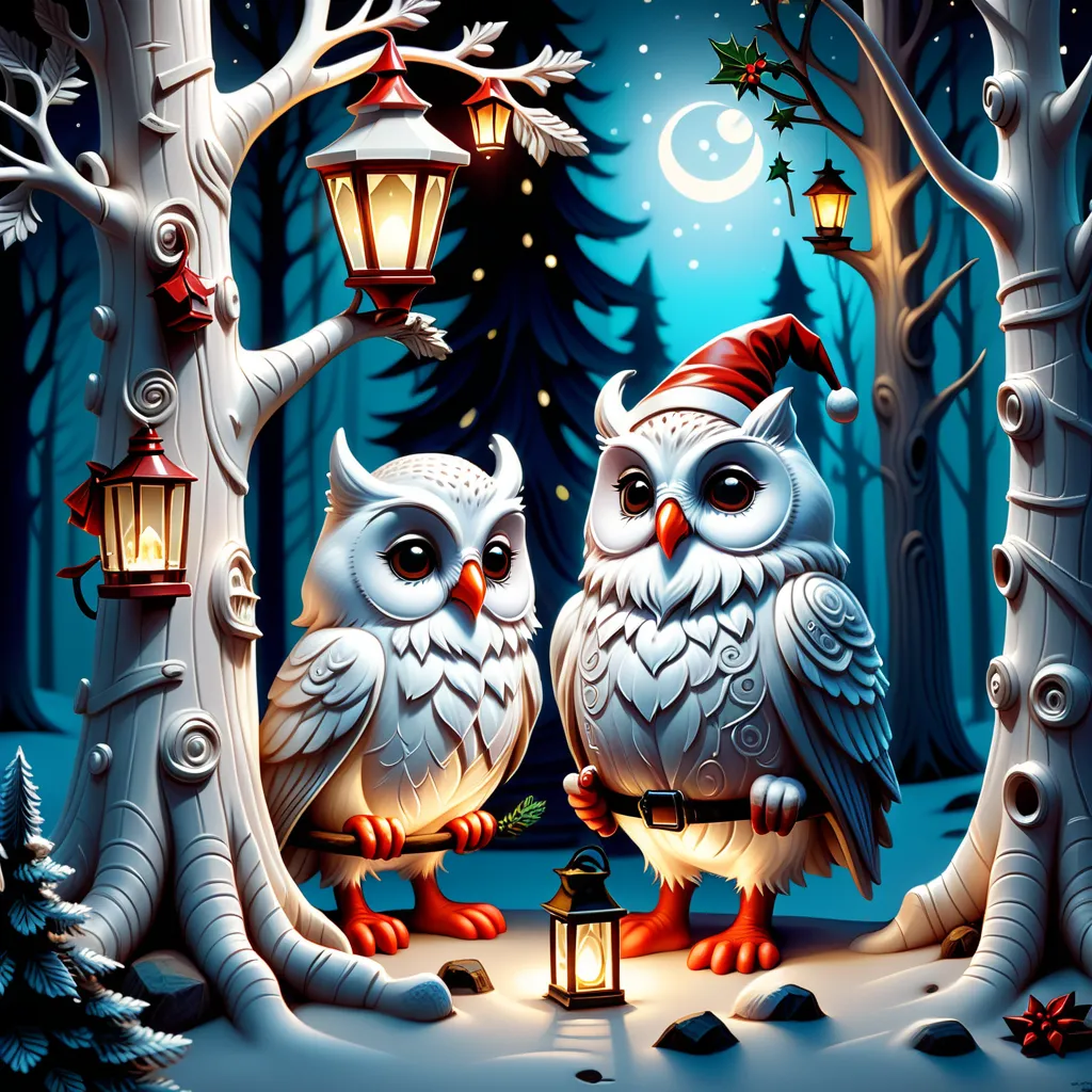 Jasper loved the tranquility of the forest, especially during the festive season. As he ventured deeper, he was startled by a soft rustling sound. Two curious owls, their feathers as white as fresh snow, had perched themselves on a nearby branch, watching him with a mix of awe and curiosity.