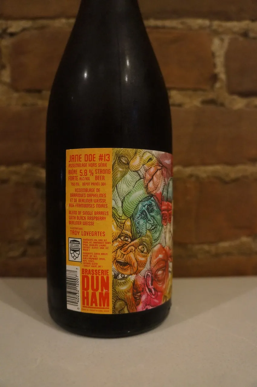 La Jane Doe #13 est une bières barriquée (passage dans un fût de chêne pour une certaine période) d'une Berliner Weisse aux framboises noires avec 5.8%. Il s'agit de la treizième édition. chaque édition est unique car produite avec des barriques orphelines. Cette année, le mélange est le suivant que des bières de Dunham : Mousson, Saison Pinacle, Rouquemoute, Beretta (voir BeerSaturday 296) avec la Berliner Weisse aux framboises et le tout vieilli entre 16 et 24 mois. C'est la première fois que je goute une Jane Doe, pas évident de mettre la main sur cette bouteille de 750 ml.