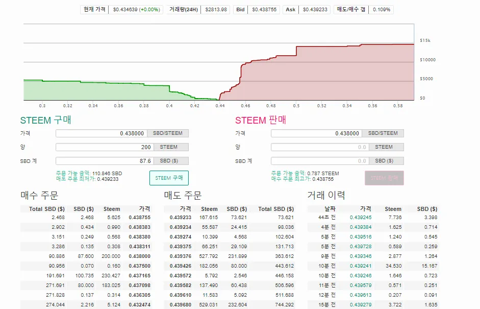 여기가 맞습니다. steem을 살 수 있네요. 1steem이 0.4385SBD 정도의 시세네요. steem 가격이 500원대고, sbd가 1100원 정도 하니까. 전 약간 낮춰서 0.4380의 가격으로 200steem을 사겠다고 오더를 넣었습니다. 좀 많나요ㅎ 여튼 이 오더를 넣고 대기 중입니다. 빨리 Steem을 들고서 다시 스팀엔진으로 넘어가고 싶지만, 일단 거래다 될 때까지 대기해 보렵니다. 아쉽게도 이 글도 두 편으로 나눠서 써야겠네요. steem을 사고 나서 귤토큰을 보유하는 과정은 다음 글에 담아 보겠습니다.
