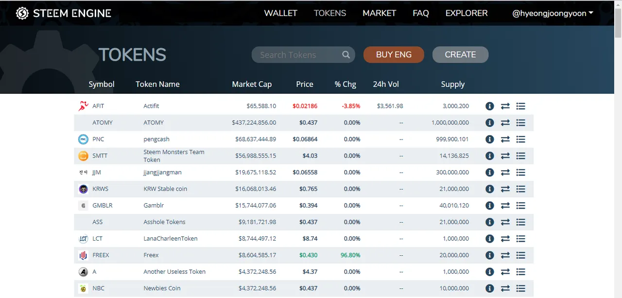 이럴수가.. 오른쪽에 스크롤 위치가 보이시나요. 예상 외로 스팀 블록체인 내의 토큰이 엄청 많군요. KRW 스테이블 코인도 있습니다. 곁눈질을 하다간 귤토큰을 못 살 판입니다. 집중집중!
