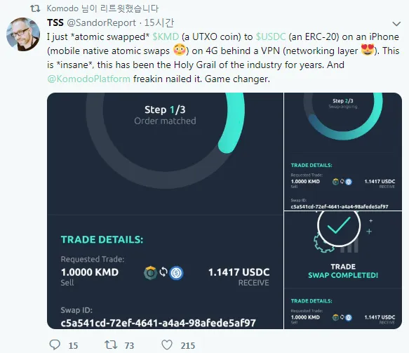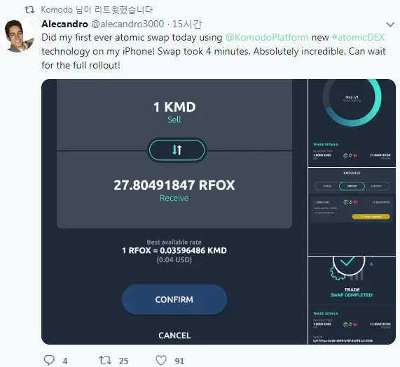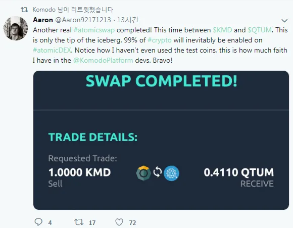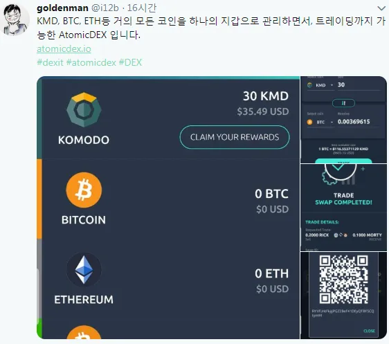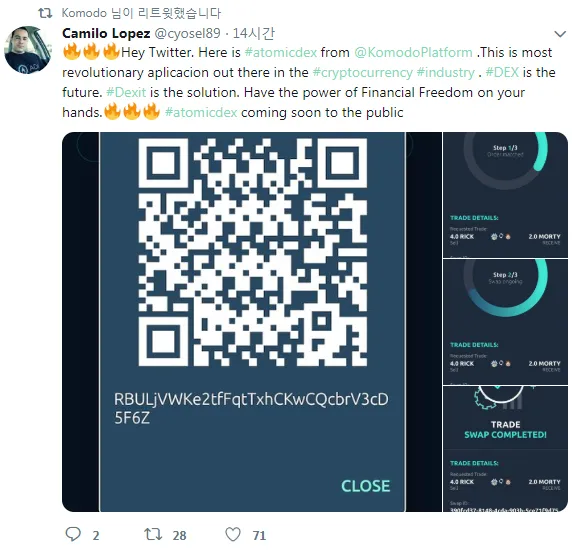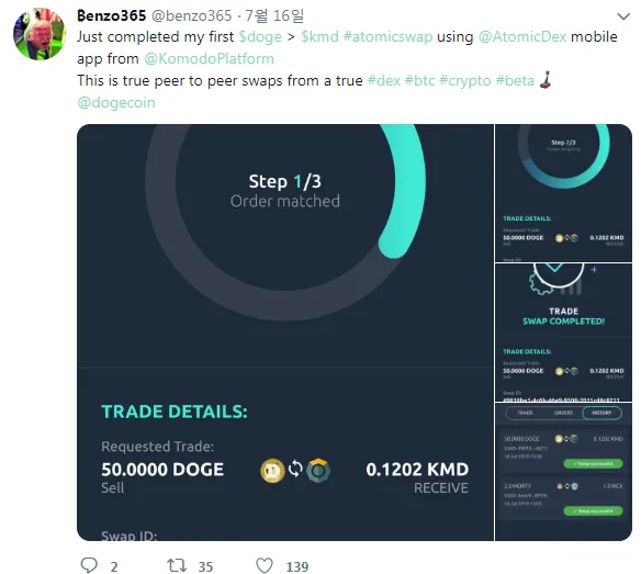 코모도 리브랜딩 이후 많은 사람들이 atomic dex를 이용하여 스왑 테스트를 진행중이며 트위터를 통해 성공 소식들이 보이고 있네요