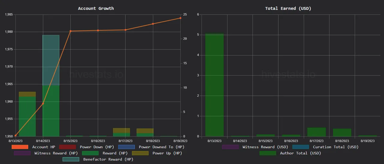 There was an increase of 25 Hive Power which is less than 1% but at least there is a movement in the number. Hivestats shows the sporadic chart of my account growth and content rewards during the previous week.