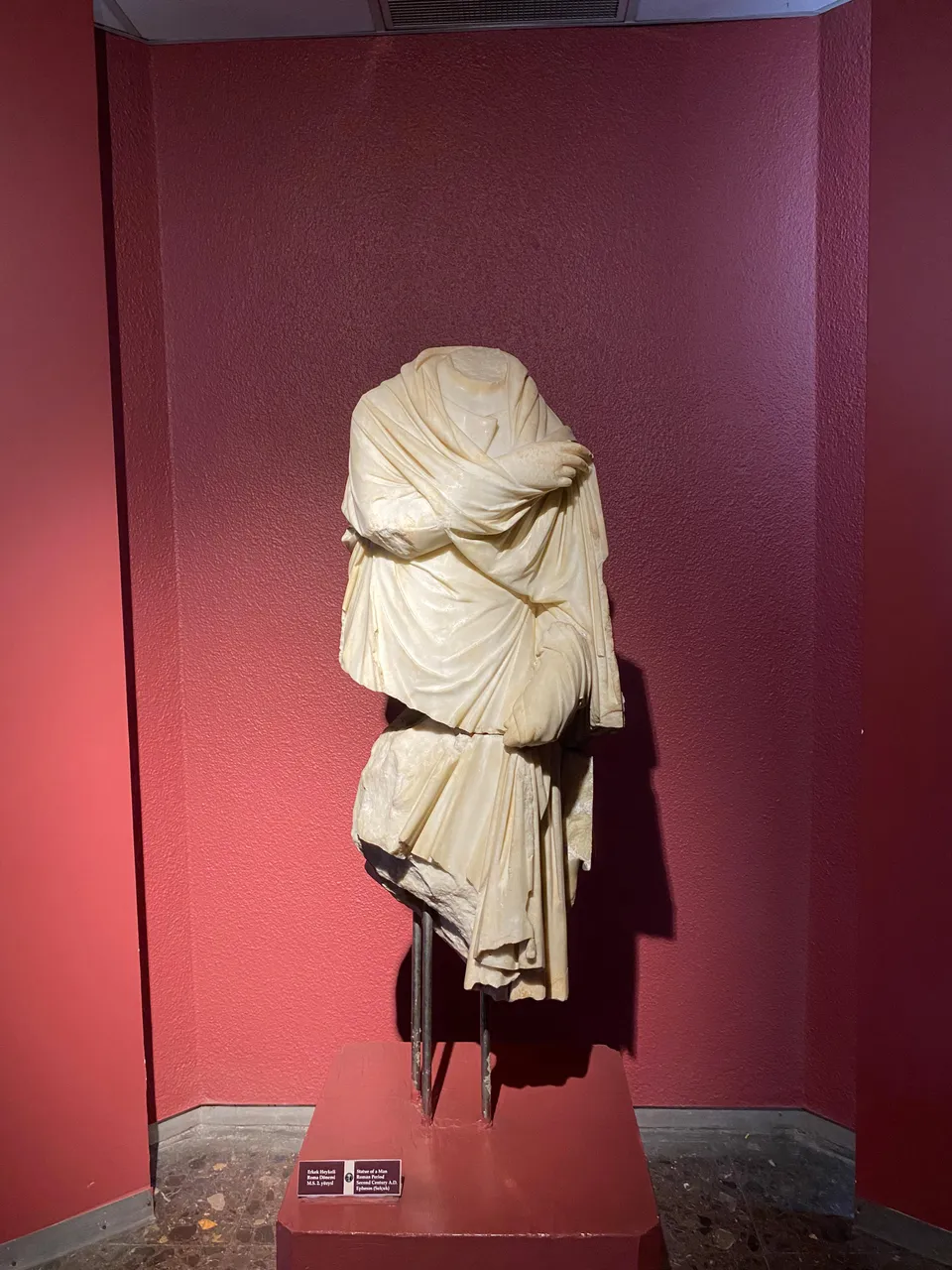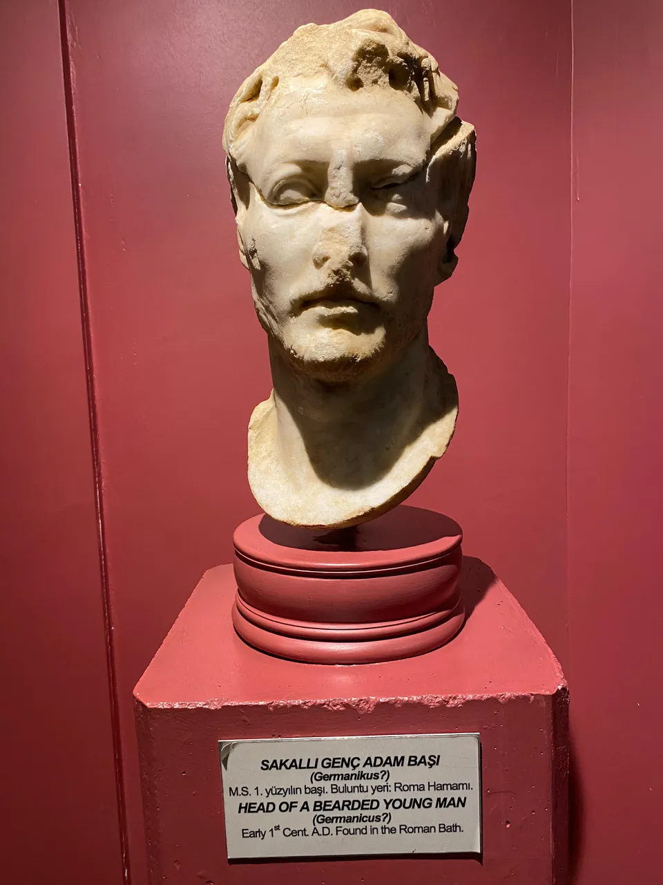 Bu heykel zarar görse de birleştirilebilmiş. Milattan sonra 1. yüzyılda yani tam 2000 yıl önce yapıldığı tahmin ediliyor. Bir roma hamamında bulunmuş. O dönem her yerde heykeller olduğunu düşünüyorum. İnsanların evinde, meydanlarda, hamamlarda, saraylarda. Germanikus'a ait olduğu tahmin ediliyor.