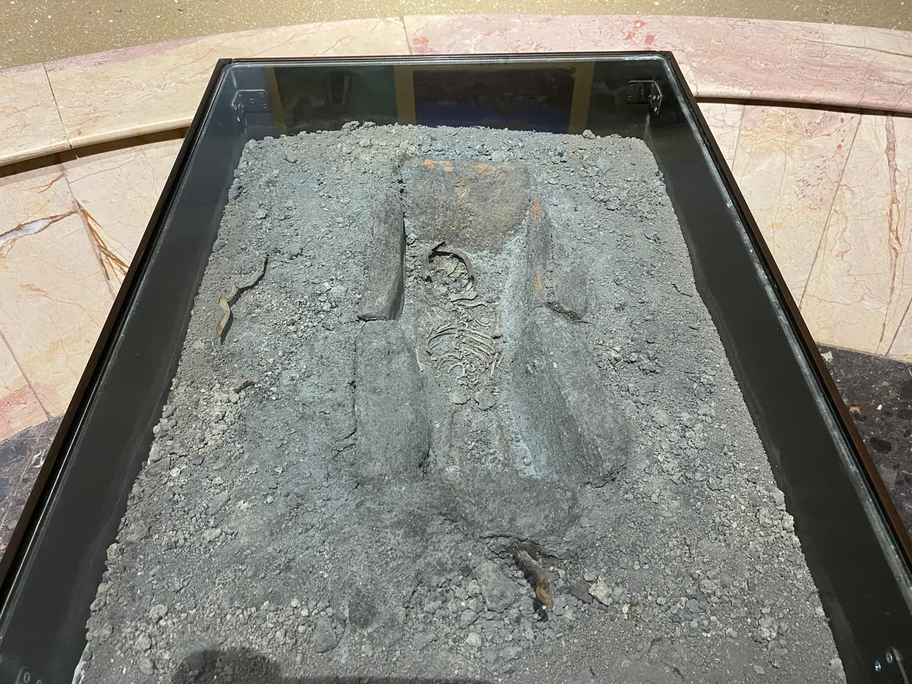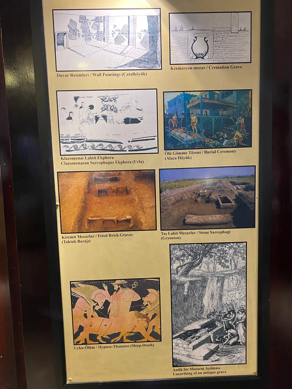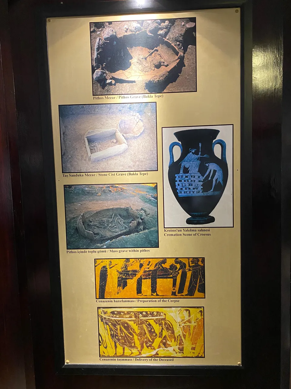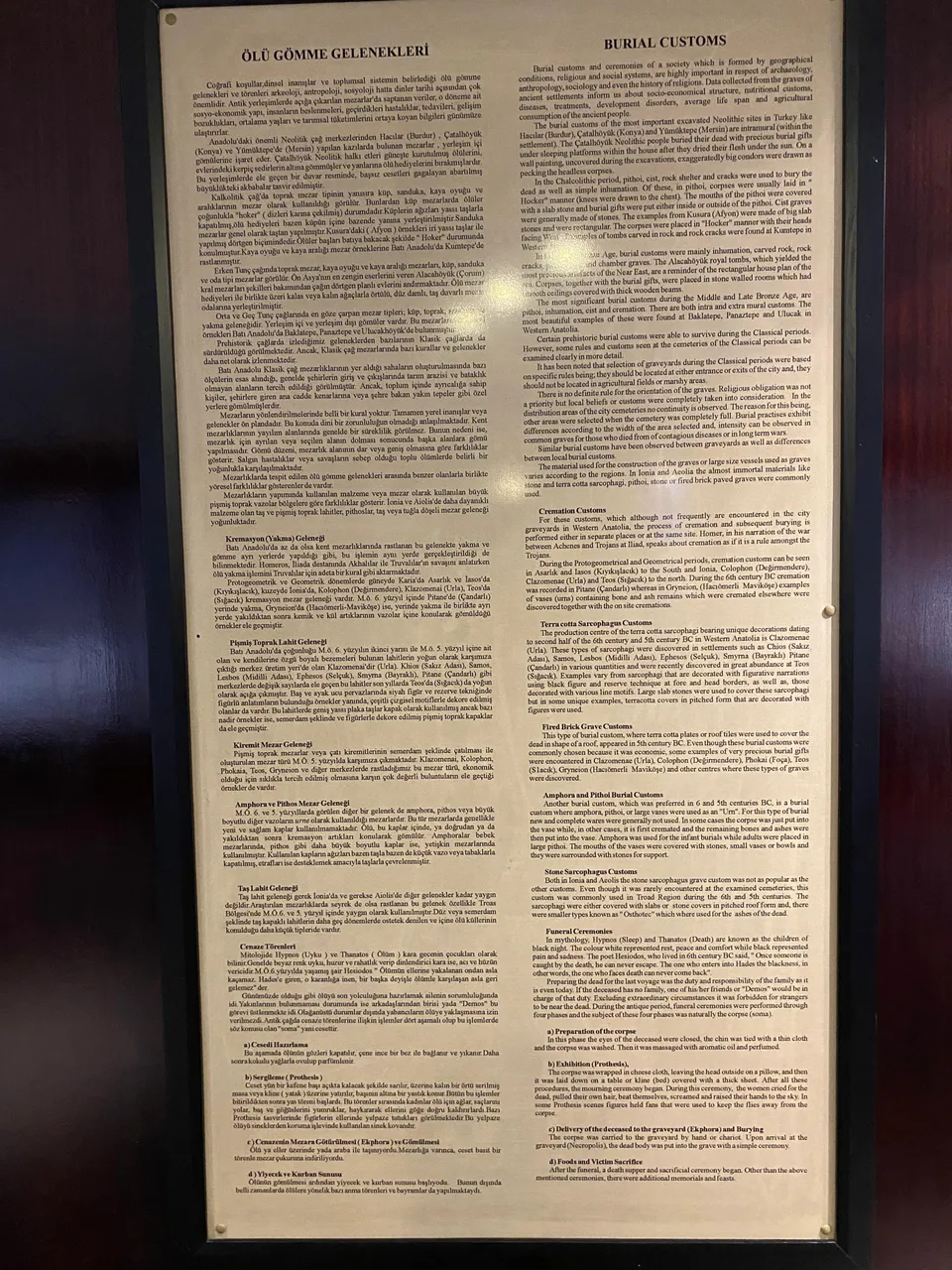 Burada da çok eski yıllara ait ölü gömme geleneklerini görebilirsiniz. Fotoğrafların yanı sıra detaylı bir bilgilendirme tabelası da var. Dönemden döneme mezar kültürü, gömme kültürü ve kullanılan malzemeler farklılık gösteriyor. Örneğin halkın mezarları mezarlıklarda olurken soylu kişilerin mezarları şehrin güzel yerlerinde, tepelerde, meydanlarda bulunuyormuş. Yine iliklerimize kadar sınıf ayrımını hissediyoruz.