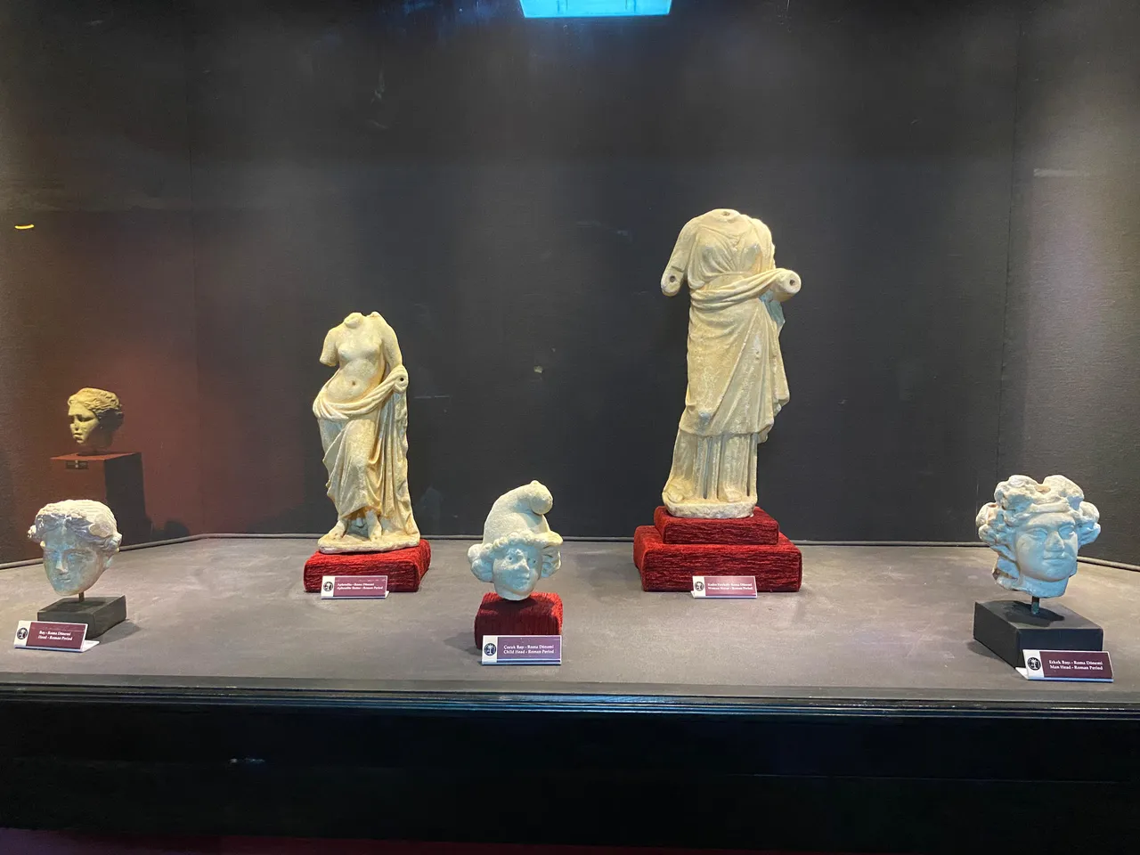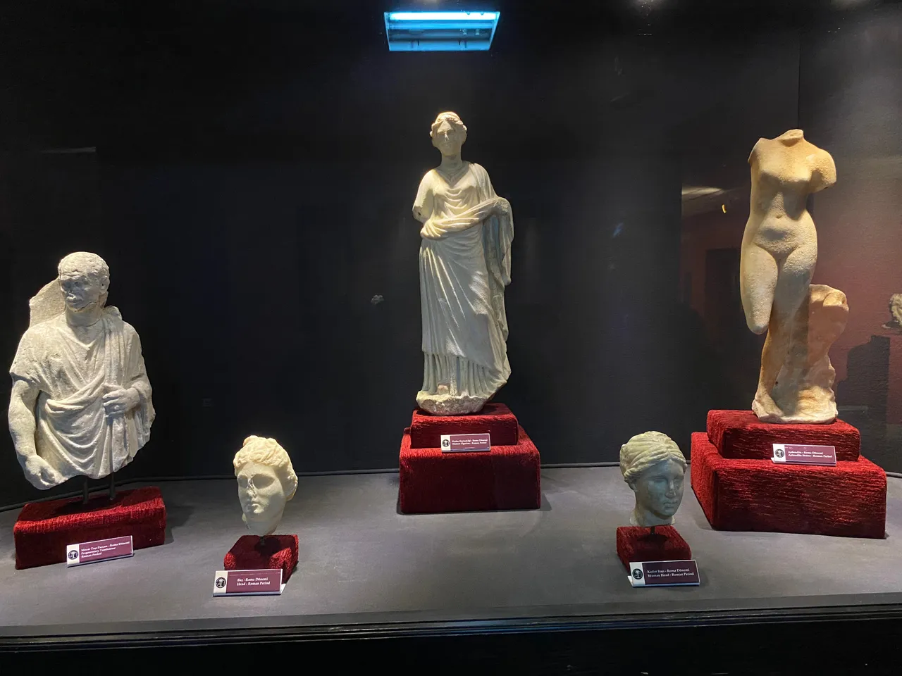 İşte Roma dönemine ait başka heykeller. Farklı türlerdeler, örneğin bir mezar taşı parçası var. O kadar harika görünüyor ki, mezarıma böyle bir heykel yaptırmayı isterdim ama bir yandan düşününce de o kadar önemli biri değilim. Romalılar gerçekten heykel konusunda ustalar. Bunu bir kez daha gördüm.