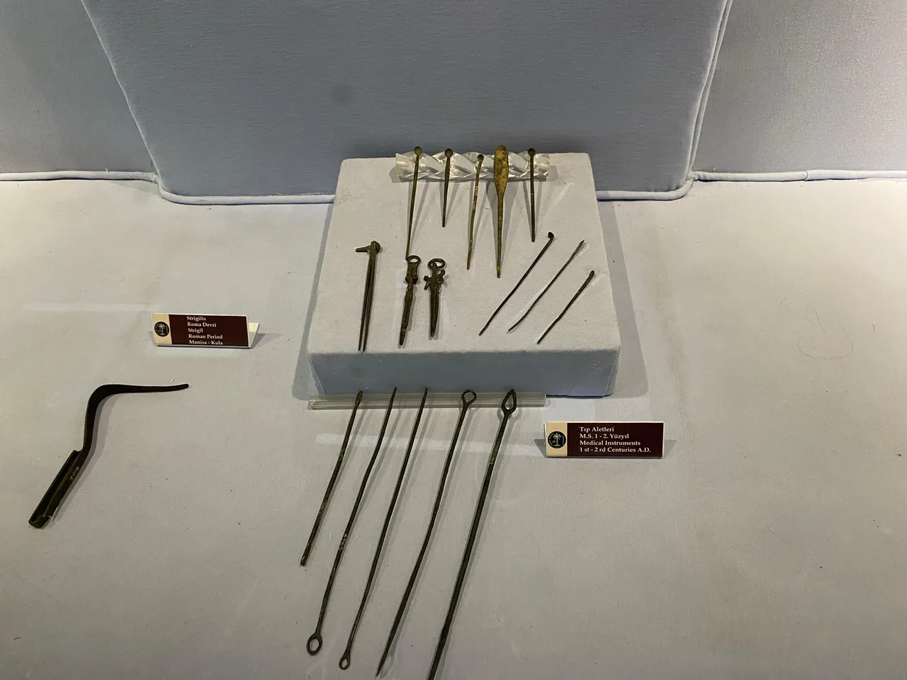 O dönemde tıp alanında da insanlar aktif bir şekilde çalışıyormuş. Bu gördüklerinizin hepsi tıp aletleri. Ne için kullanıldıklarına dair bir fikrim yok ama eminim dönem için çok işe yarayan şeylerdir.