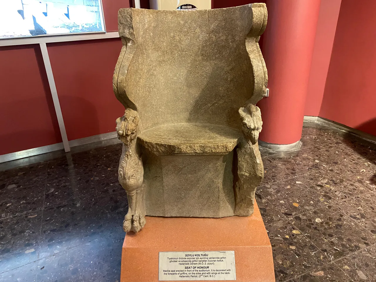 Tiyatronun önünde soylular için ayrılmış bir koltuk. Görkemli görünüyor, o zamanlarda sınıf farkı insanlara derinden hissettirilmiş. Gerçi bunu zaten biliyoruz.