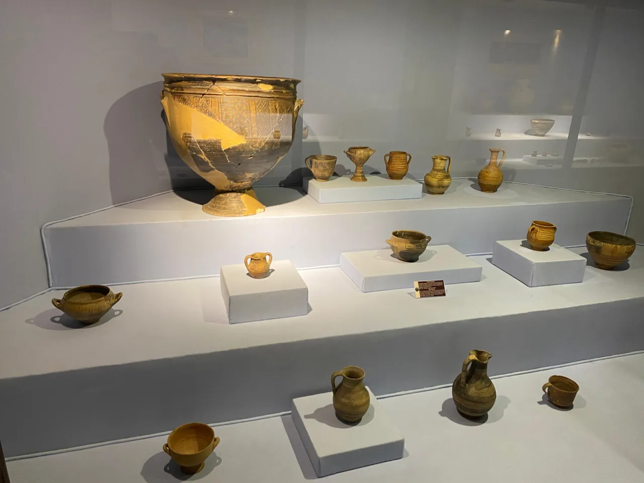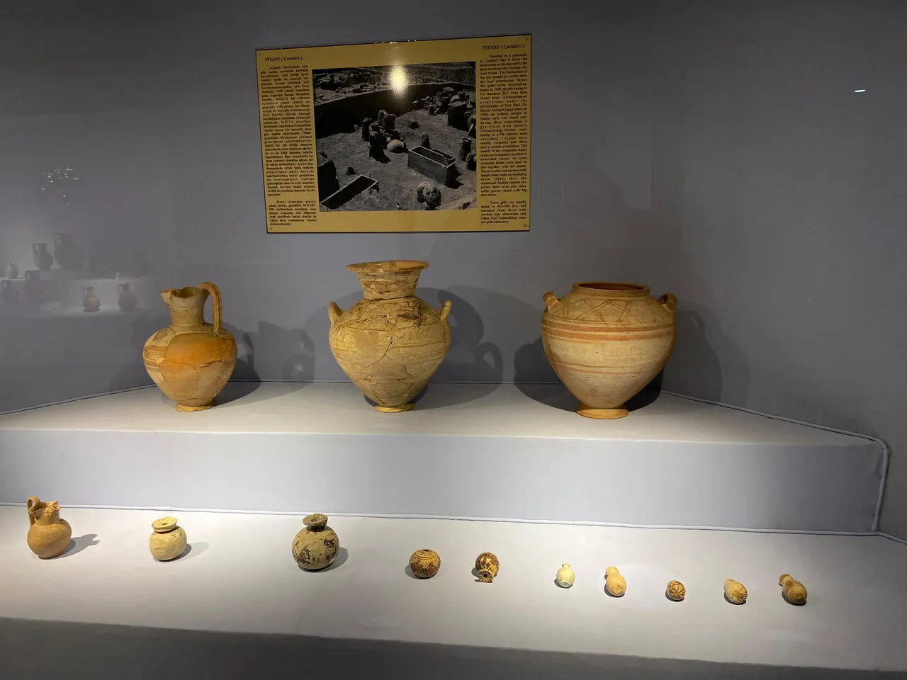 Burada gördüğünüz eşyalar da mezarlıkta bulunmuş eşyalar. Bazı dönemde insanlar yakılarak bazı dönemde pişmiş topraktan mezarlara, kiremit mezarlara, amphora ve pithos mezarlara ya da taştan yapılmış mezarlara koyularak gömülürmüş. Yakılarak gömülen insanların da külleri bu gibi küplerde saklanırmış. Bazılarının kapağı iyi kapatılmış şekilde bulunmuş, bazıları ise o kadar da özenilmemiş.