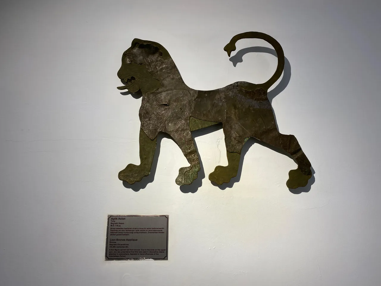 Bu da Bayraklı kazısında çıkarılmış bir aslan betimlemesi. Bronz metali keserek yapılmış. Çok fazla işçilik olduğu kesin. Üzerindeki deliklerden bir duvara tutturulup dekoratif olarak kullanıldığı düşünülüyor. Dekorasyona çok önem verdikleri kesin. Acaba eşleri tarafından istenen bir şey mi :P