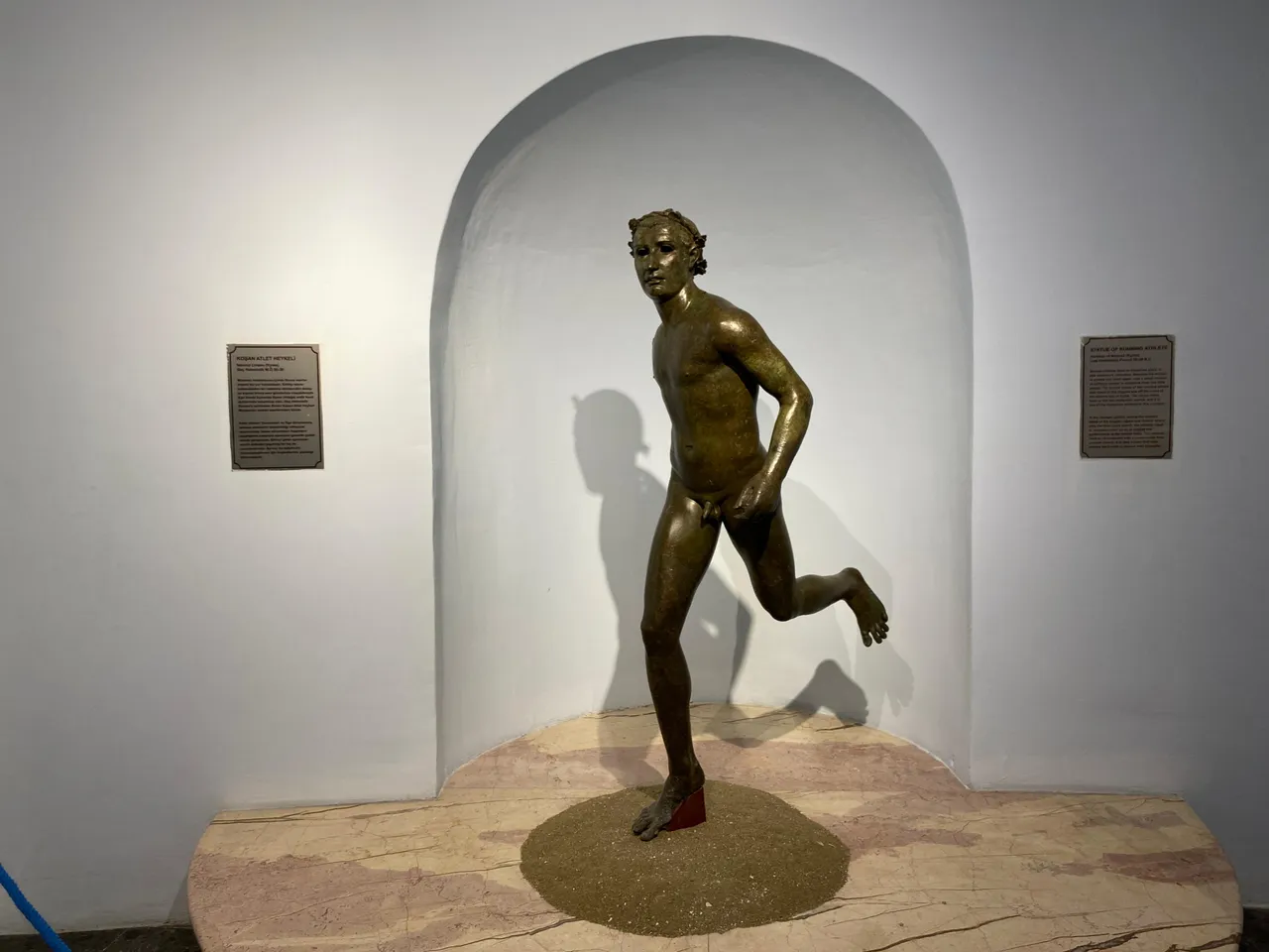 Bu koşan atlet heykeli geç helenistik döneme ait. Muhtemelen olimpiyatlarla ilgili. Heykel o kadar detaylı ki ayak parmaklarının arasındaki boşluktan, cinsel organa kadar her şeyi mükemmel yontmuşlar. Meme uçları bile var haha.