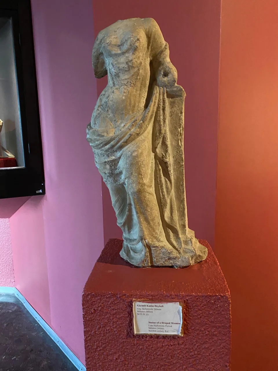 Örneğin bu heykel çok daha eskiye helenistik döneme ait. Bir öncekiler kadar güzel görünmüyor ama ondan daha eskiden yapıldığını düşünürsek mükemmel görünüyor. Kadının gövdesinde harika detaylar var.