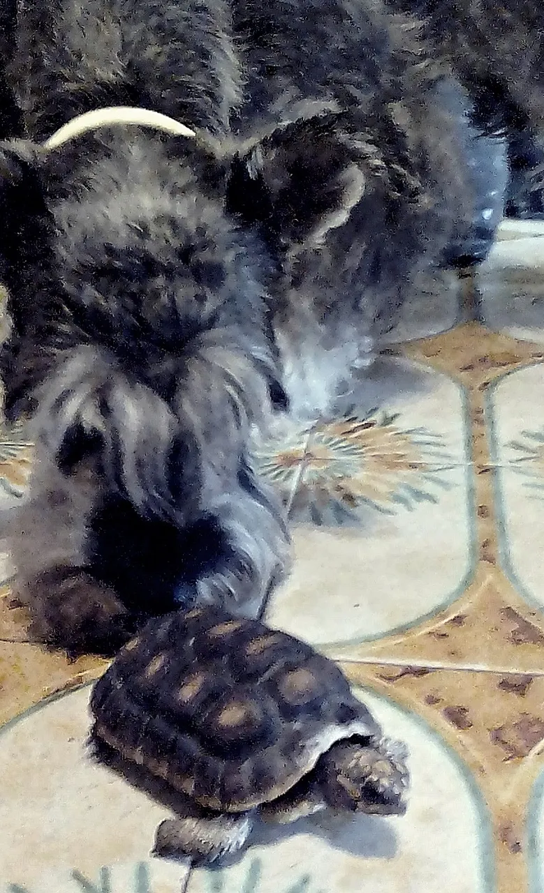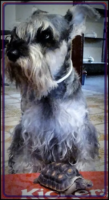 Cuando hablamos de amistad, normalmente nos identificamos con los seres humanos, pero muy pocas veces con los animales, pues en esta ocación quiero honrar la amistad entre los animales de distintos generos, como es el caso de mis dos mascotas: Catalina y Rocket, una morrocoya y un perrito de raza Schnauzer mediano.