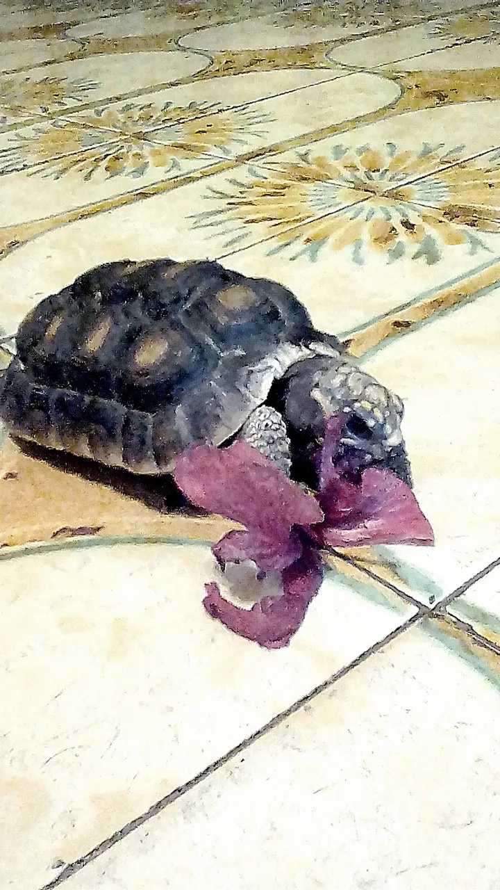 Ambos han convivido en nuestro hogar tras conocerse y aprender a respetarse desde hace mas de cuatro años. Una de las anecdotas más divertidas de estos dos amigos, es cuando Catalina una vez que alcanzó un tamaño respetable la deje en el piso por primera vez, no sabia que hacer pero en cuanto olió las flores de Cayena se fue velozmente hasta ella, si como lo leen "velozmente" esta morrocoya tiene una sorprendente velocidad cuando se trata de comida(risas).