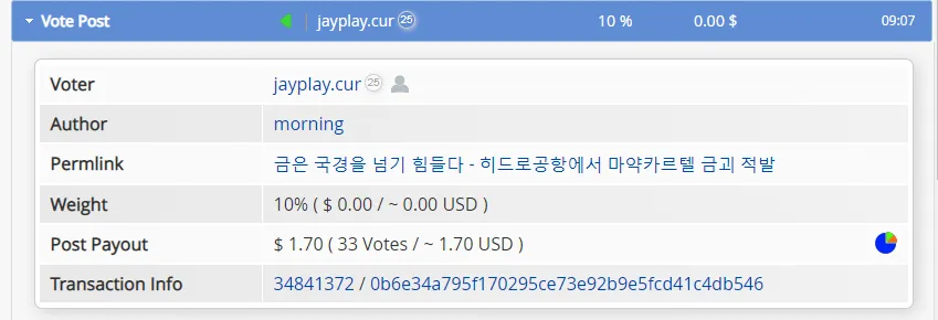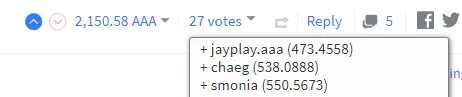 - 이제 jayplay.aaa 라는 계정으로 AAA를 업보팅할때는 업보팅시 10%만 해도 AAA는 100% 업보팅이 됩니다.