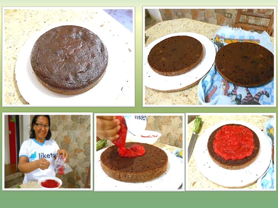 Está lista mi torta, la dejo enfriar un poco para luego desmoldar. Ya fría, procedo a cortar por la mitad para colocar el relleno. Coloco la compota en una manga improvisada y relleno sin llegar a los bordes, para que cuando coloque la otra capa no se salga por todos lados.