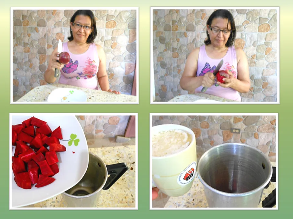 En el siguiente paso, corto la remolacha cruda, luego la coloco en la licuadora, agrego la leche con el vinagre, el aceite y licuo hasta lograr una mezcla sin grumos, reservamos.