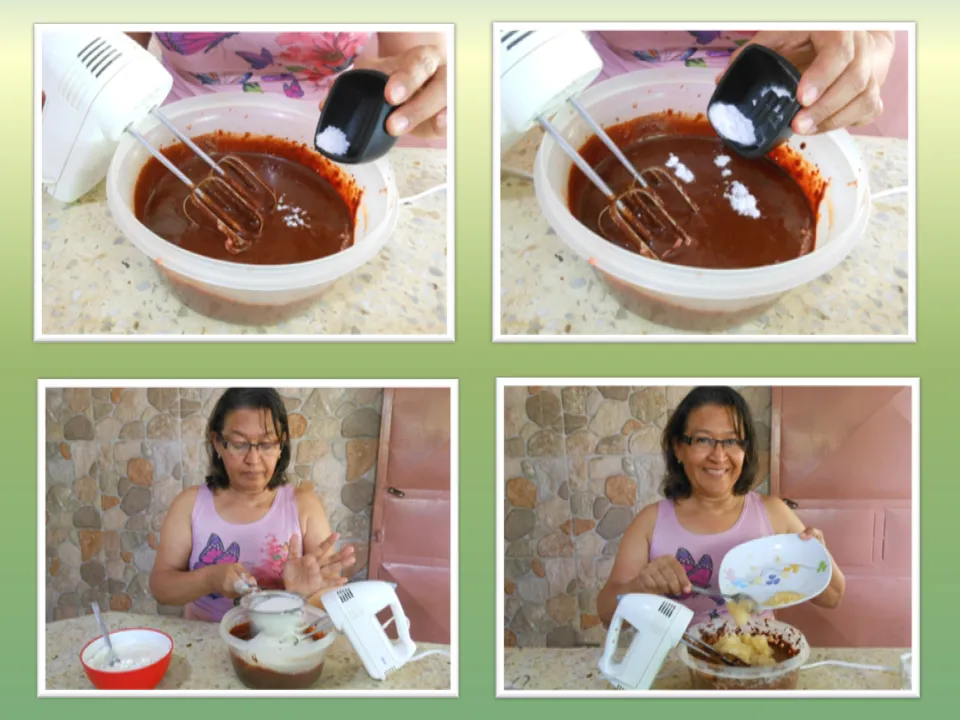 I add the salt, baking soda and flour, passing it little by little through a sieve. I had forgotten to add the applesauce and put it at the end, but the result is still excellent.