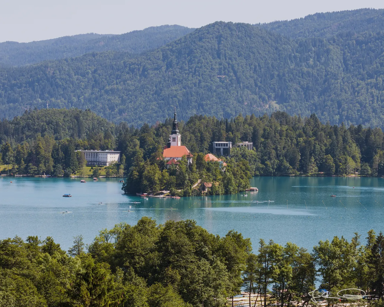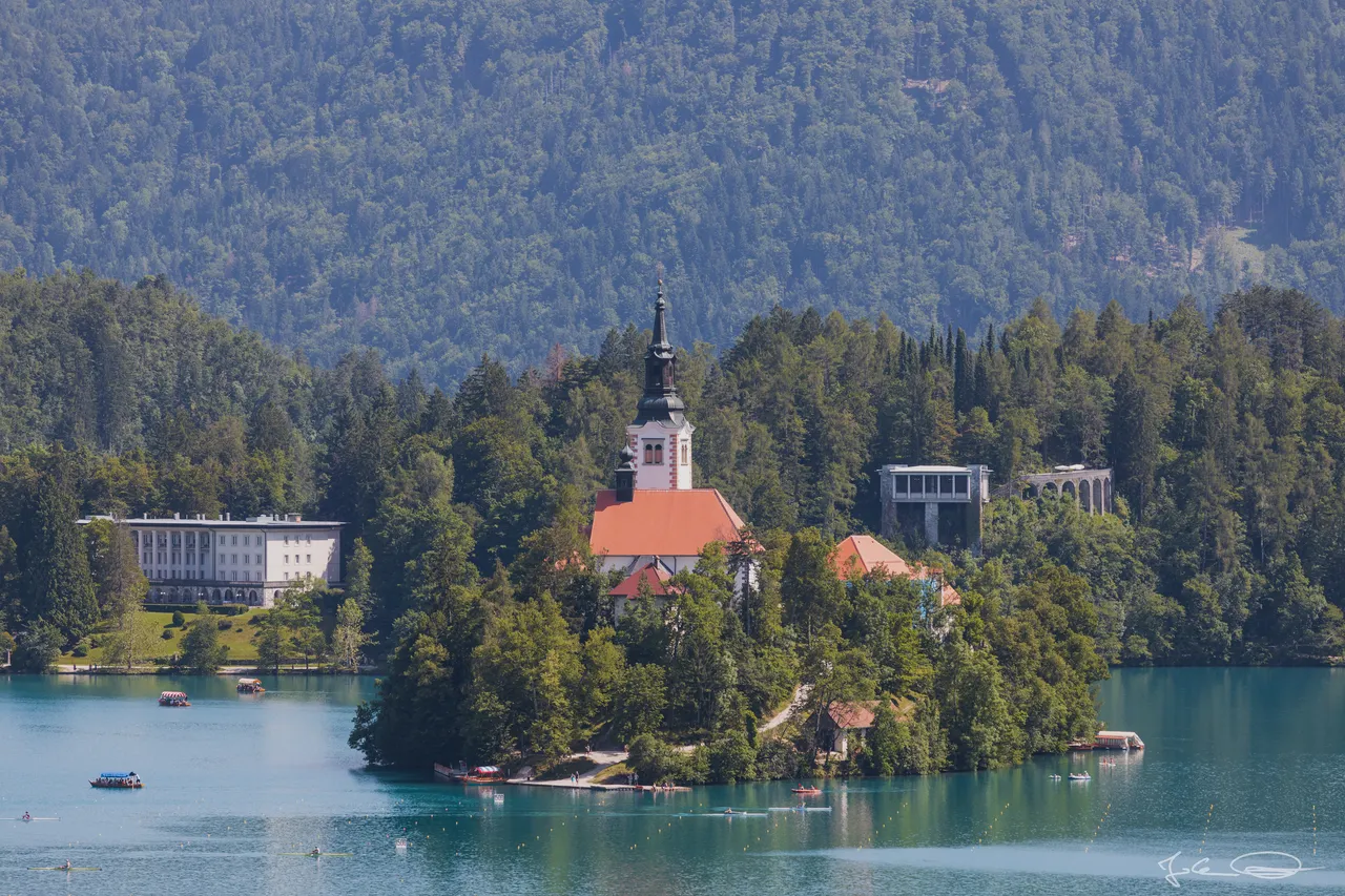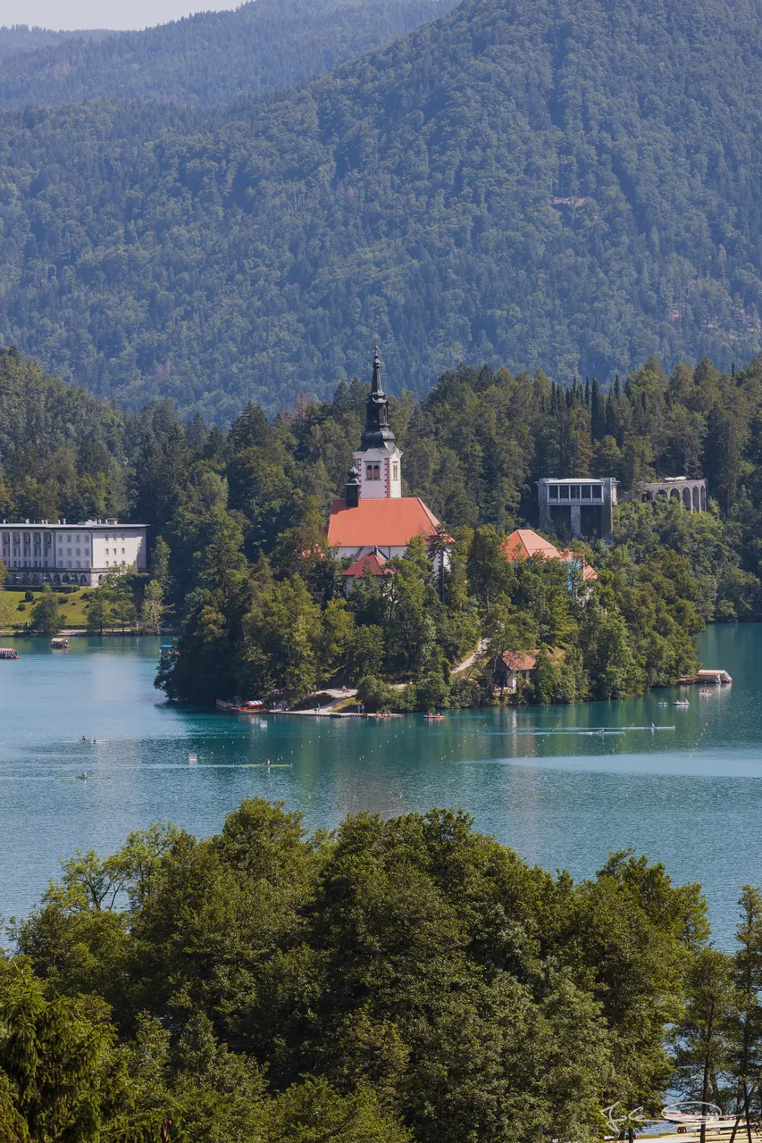 From the west, a bit further away and above the lake, I photographed the island "Blejski Otok" with the St. Mary's Church in Bled. | Aus westlicher Richtung, etwas entfernt und oberhalb des Sees habe ich dann die Insel "Blejski Otok" mit der Marienkirche von Bled fotografiert. |
