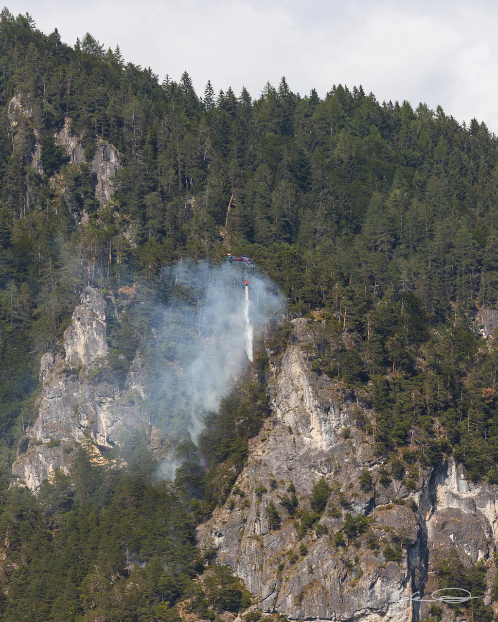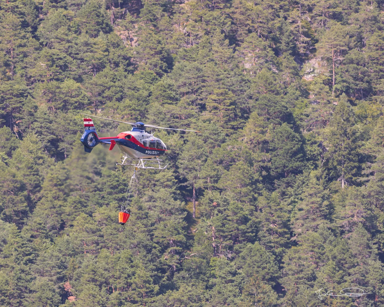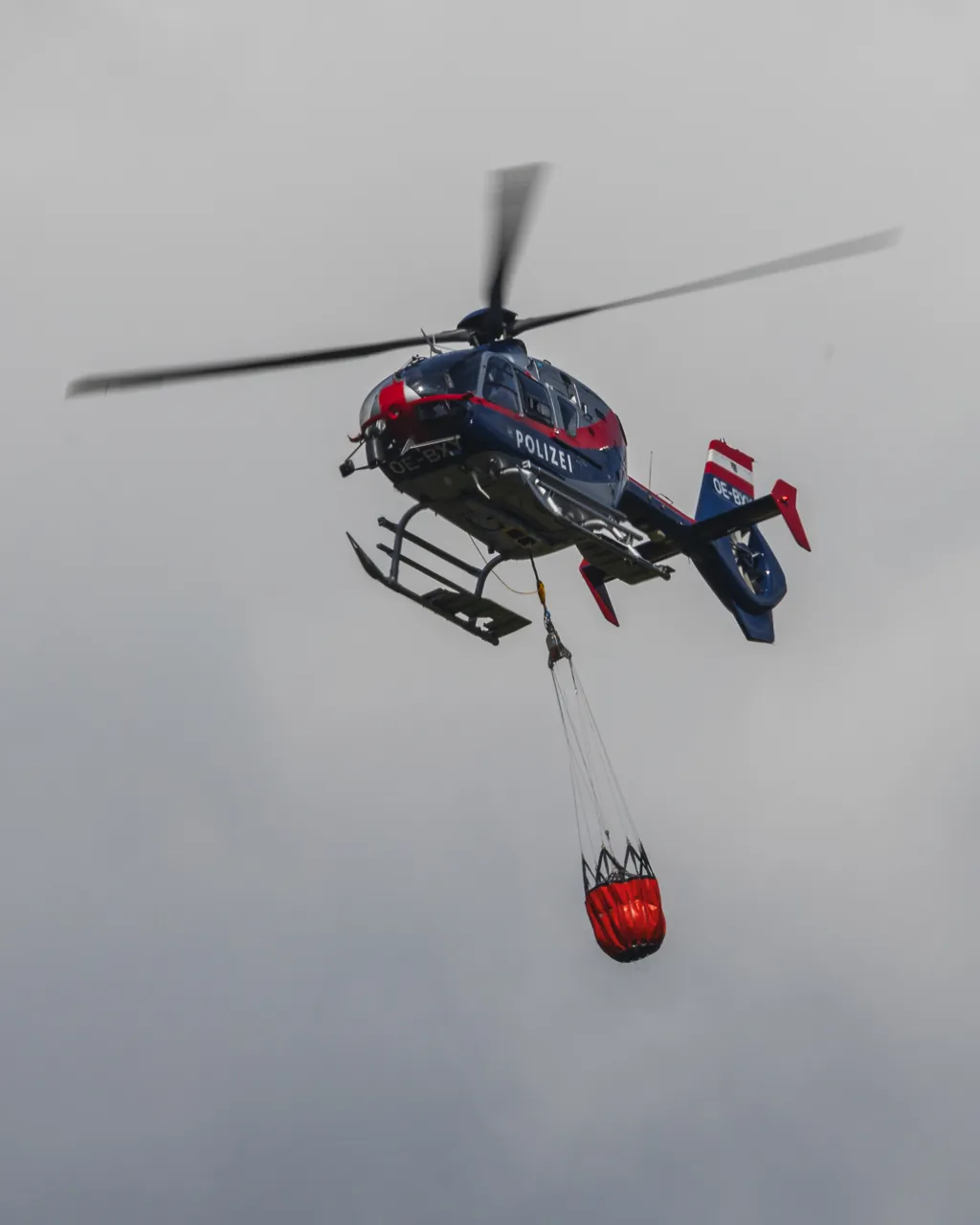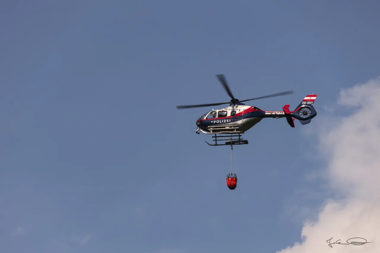 A police helicopter has continuously brought firefighting water with an attached container from the river Drau and dumped it above the forest fire. | Ein Polizeihubschrauber hat in einem angehängten Behälter laufend Löschwasser von der Drau geholt und oberhalb des Waldbrandes abgeschüttet. |