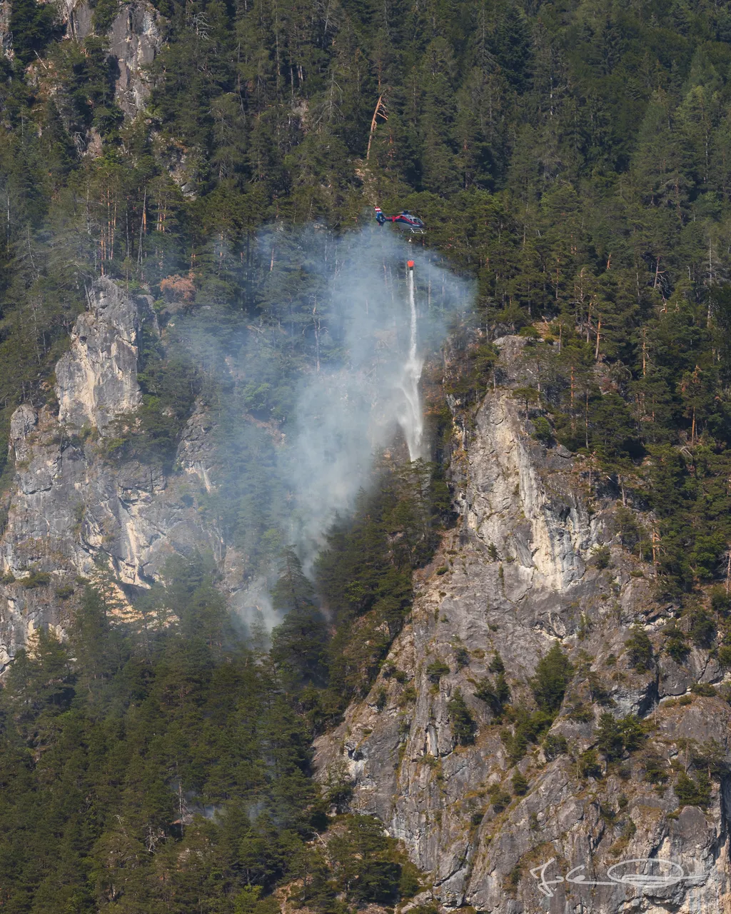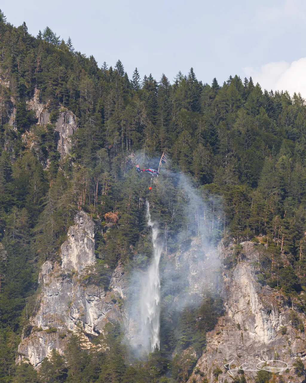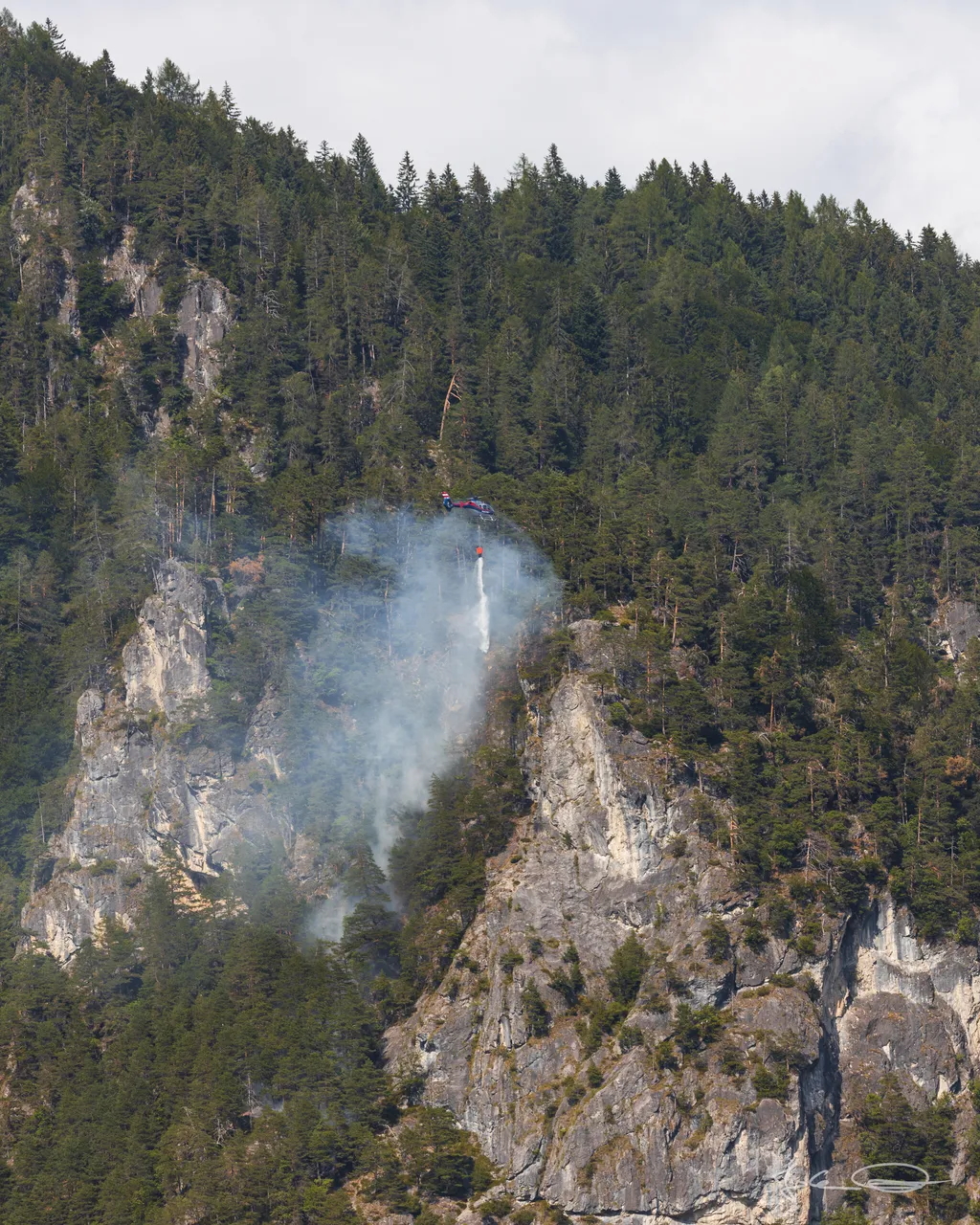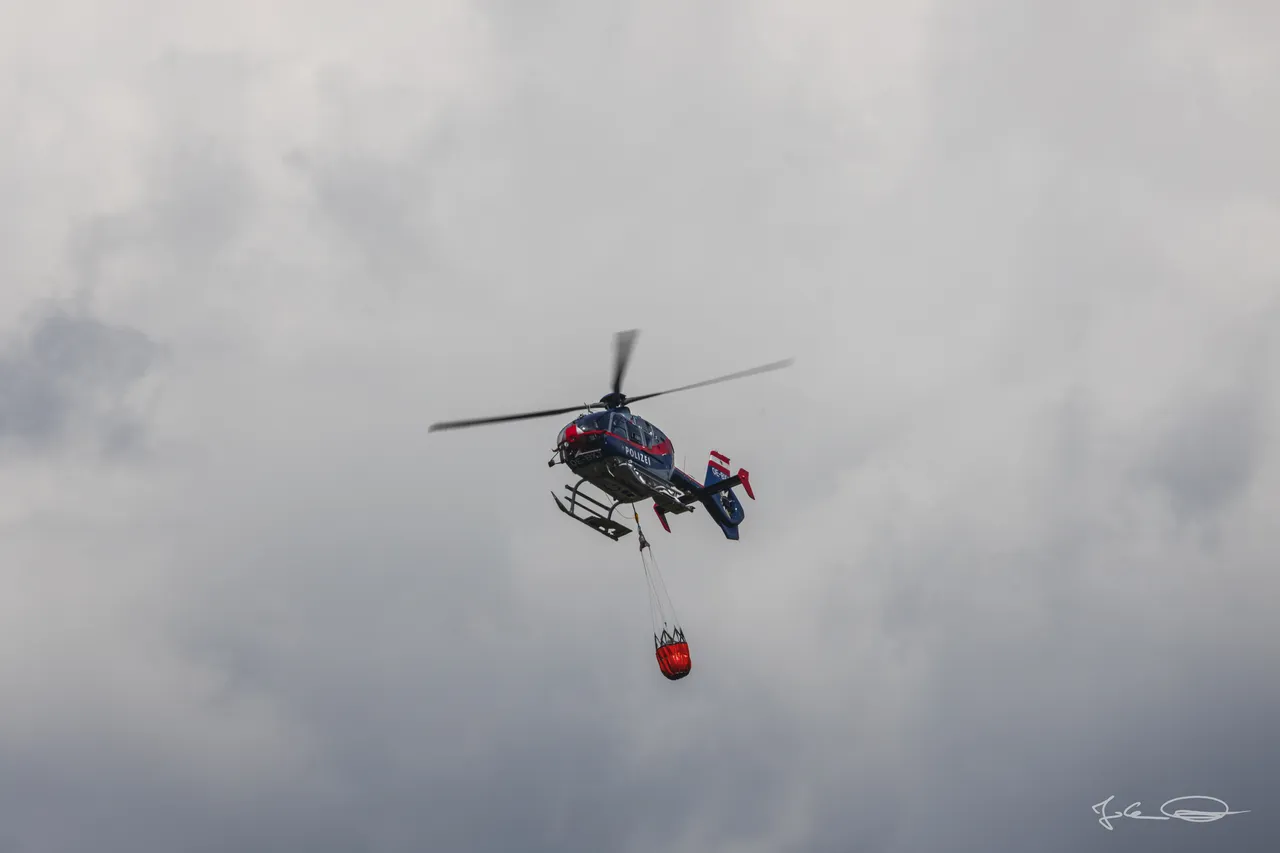 A police helicopter has continuously brought firefighting water with an attached container from the river Drau and dumped it above the forest fire. | Ein Polizeihubschrauber hat in einem angehängten Behälter laufend Löschwasser von der Drau geholt und oberhalb des Waldbrandes abgeschüttet. |