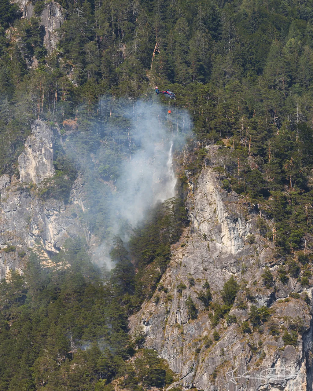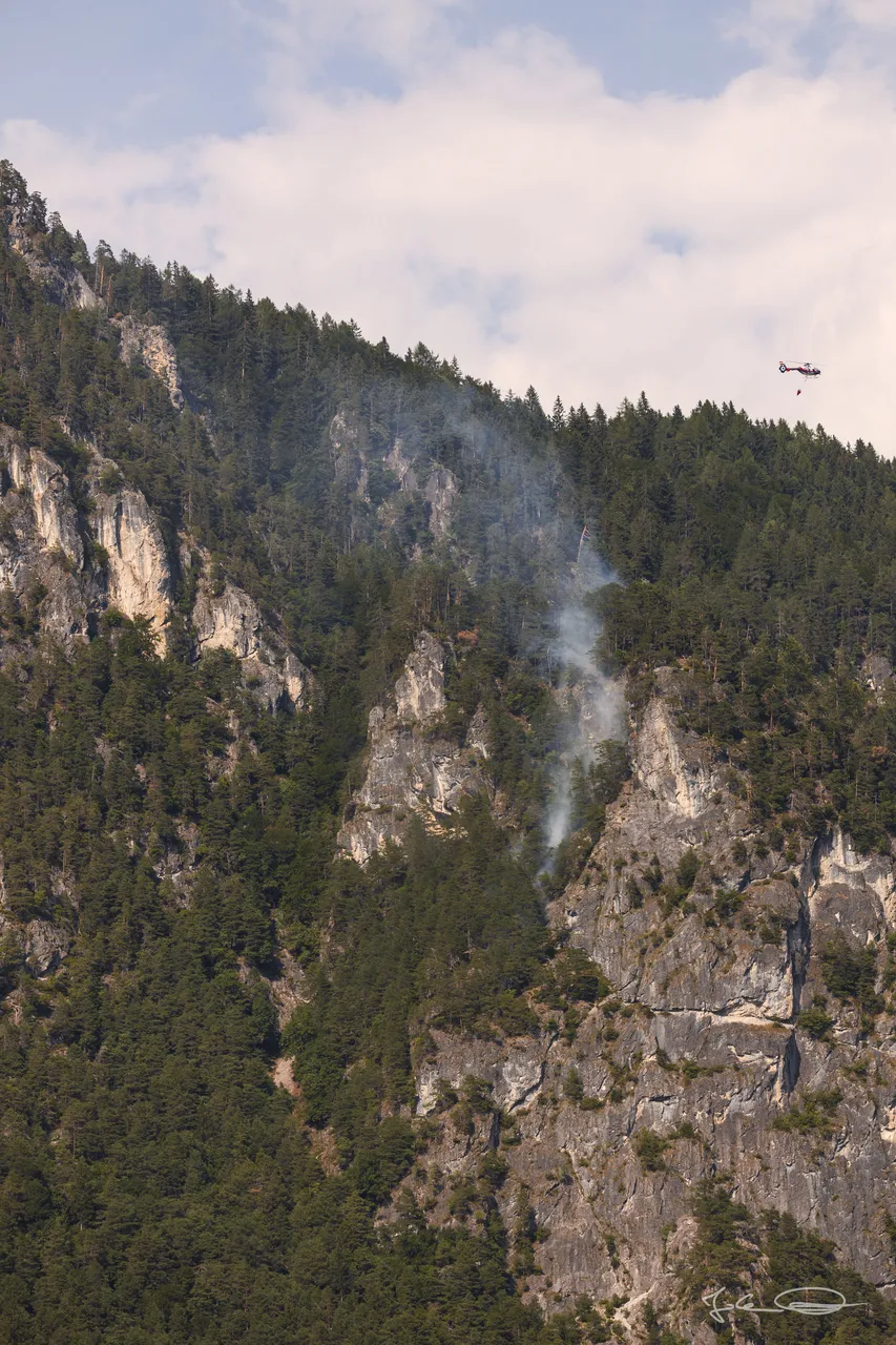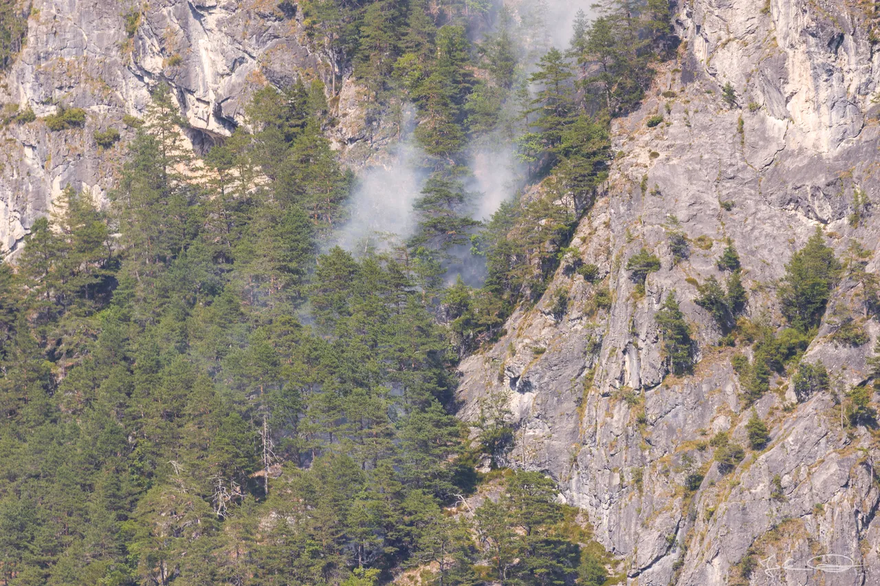 At home, my mother and father used binoculars to look at the opposite side of the valley (about 1.5 km / 4.900 ft as the crow flies), where smoke has risen pretty high up among the trees in the steep rock face. | Zu Hause haben meine Mutter und mein Vater mit dem Fernglas zur gegenüberliegenden Talseite (etwa 1,5 km / 4,900 ft Luftlinie) geschaut, wo Rauch ziemlich weit oben zwischen den Bäumen in der steilen Felswand aufgestiegen ist. |