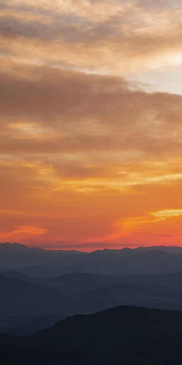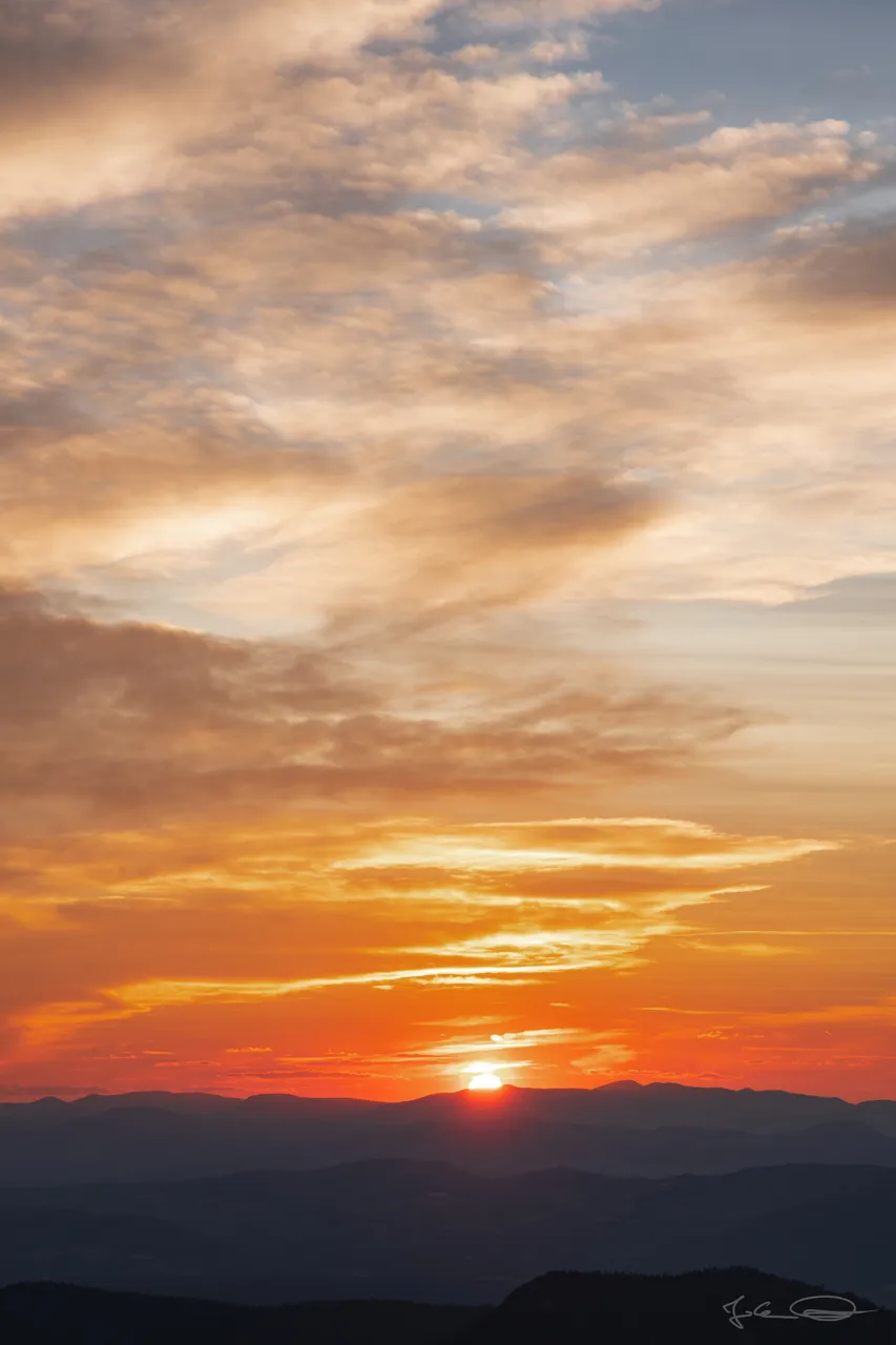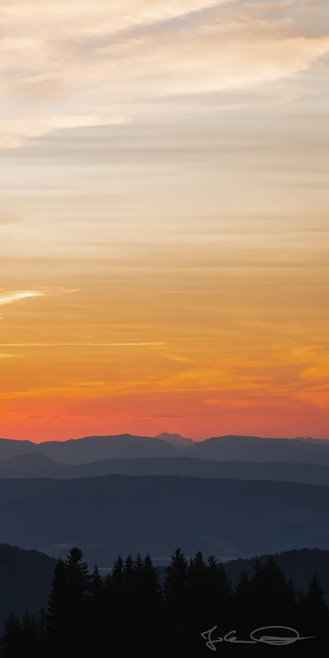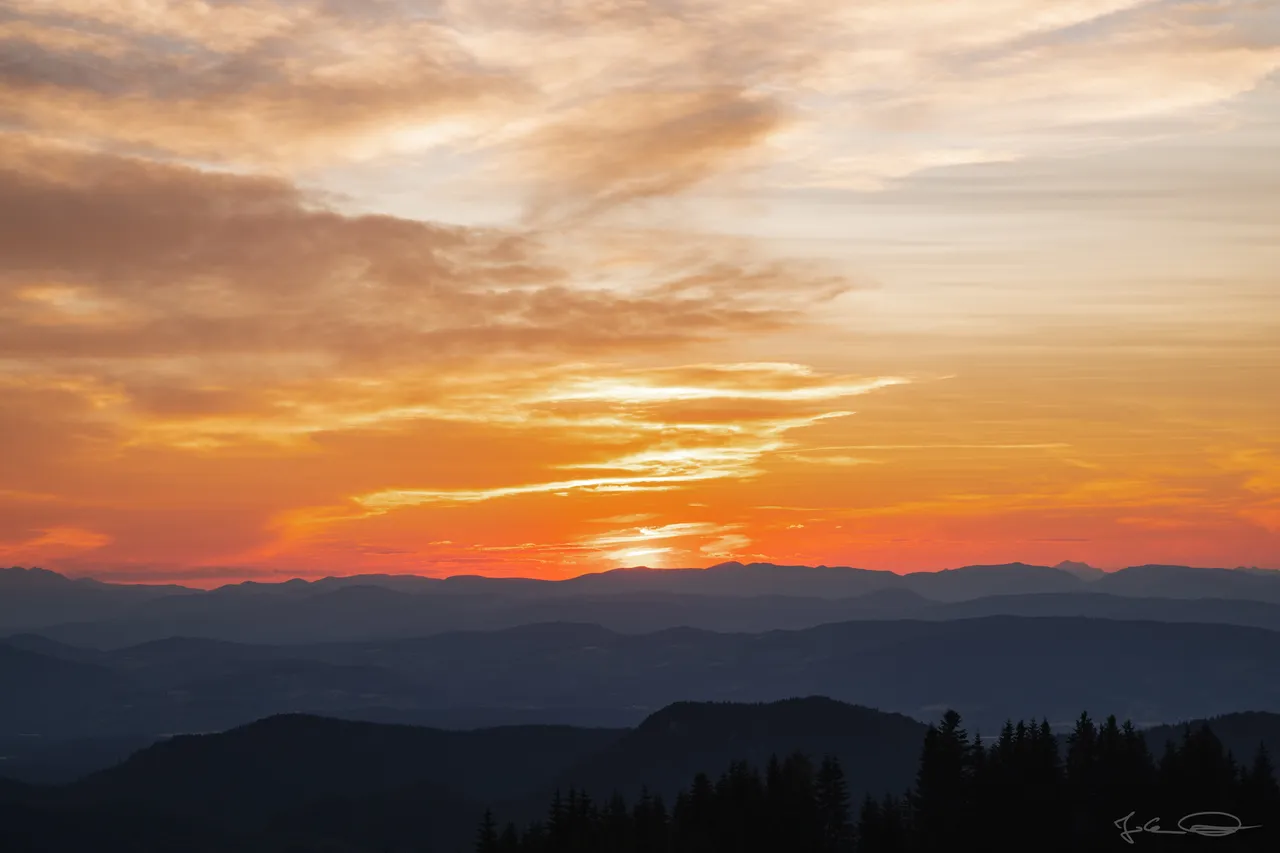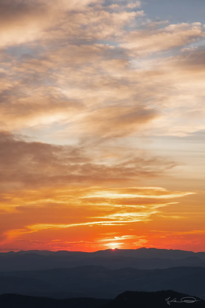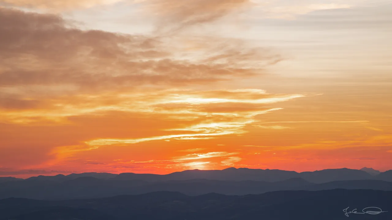 In the next few days there is a third part of this sunset, where the right, almost cloudless area of the landscape with the different shaded layers of the mountains can be seen. | In den nächsten Tagen gibt es noch einen dritten Teil dieses Sonnenunterganges, wo der rechte , fast wolkenfreie Bereich der Landschaft mit den verschieden schattierten Schichten der Berge zu sehen ist. |