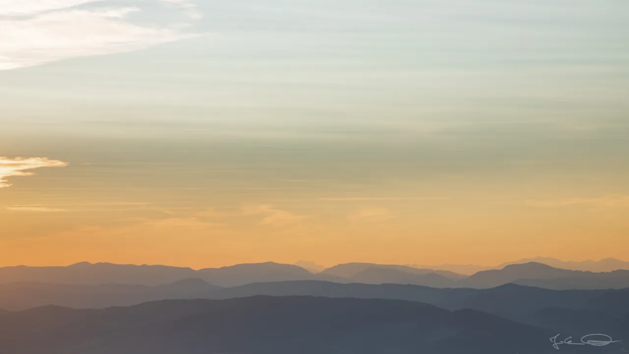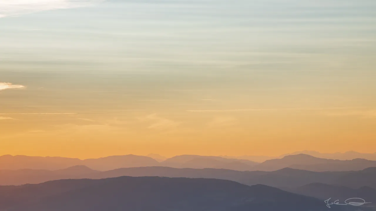A soft pastel-colored transition from the orange of the sunset to the pale blue of the sky, which looks almost painted with brushstrokes. | Ein sanfter pastellfarbener Übergang vom Orange des Sonnenuntergangs bis zum Hellblau des Himmels, der fast wie mit Pinselstrichen gemalt aussieht. |