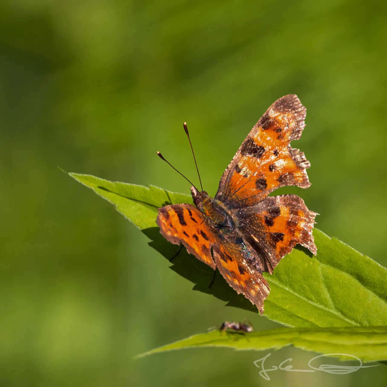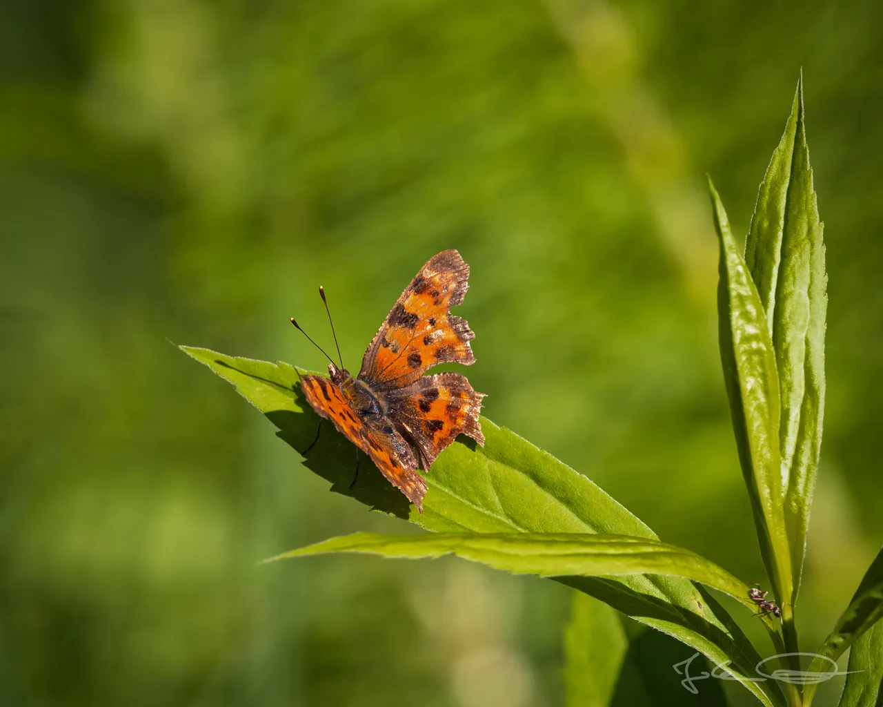 One could almost assume, that the little butterfly is resting from a fight, which he hopefully did not have with the ant that's on the other leaf. | Es sieht fast so aus, als ruhe sich der kleine Falter von einem Kampf aus, den er hoffentlich nicht mit der Ameise gehabt hat, die auf dem anderen Blatt unterwegs ist. |