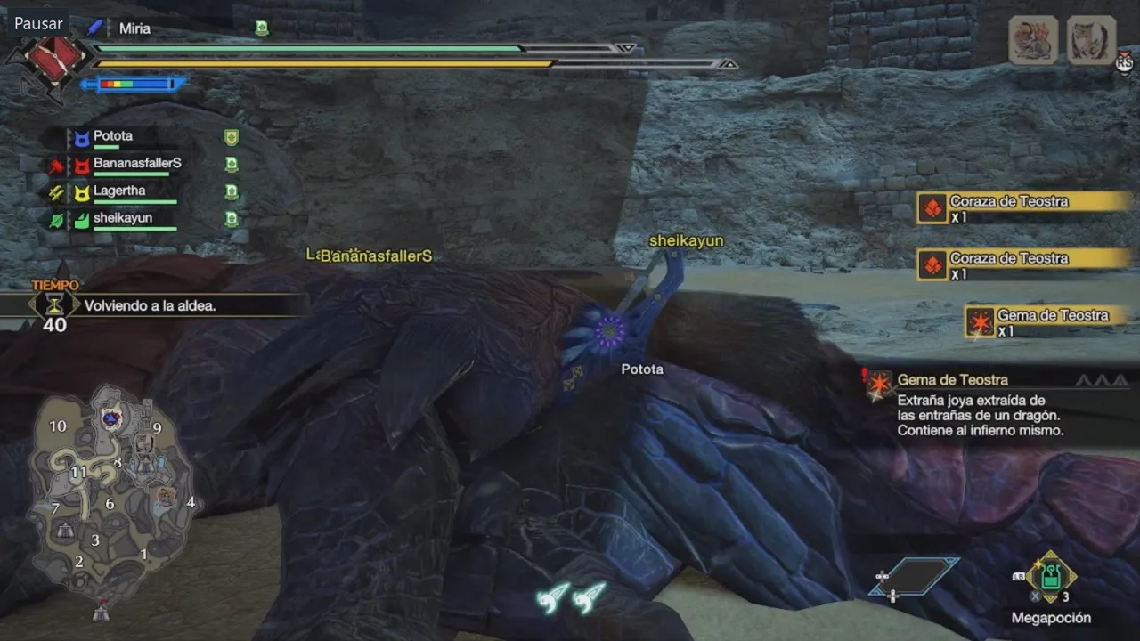 Por cierto, siempre hay tiempo para recoger minerales, huesos o lo que sea que este en el campo, mientras se está en la batalla. Hacer eso te convierte en un verdadero cazador o en presa fácil para morir con un fuerte ataque jajaja, pero sin adrenalina, no hay diversión frenética. Al final logre extraer del cuerpo del Teostra, una gema que de por si es algo difícil de obtener, pero luego de una batalla tan intensa, no podía obtener una recompensa pequeña.