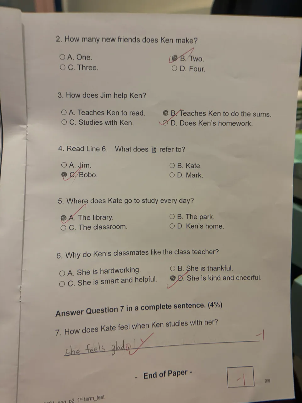 說回她的測驗卷,我不知道大家看到有什麼感覺,我不是那些虎媽,我也不是無理的要求大寶每科都必須要滿分,但是看到他這樣無理被扣除分數,我覺得有點不值得。英文那兩兩條題目,一個寫明是用完整句子,她沒有寫上標點符號被扣分,絕對是應該的,但是另外一個寫明是短答案,那個不是完整句子,我不理解為什麼還需要加上標點符號?