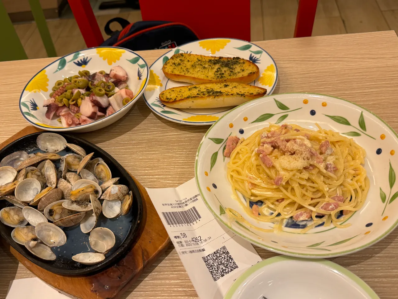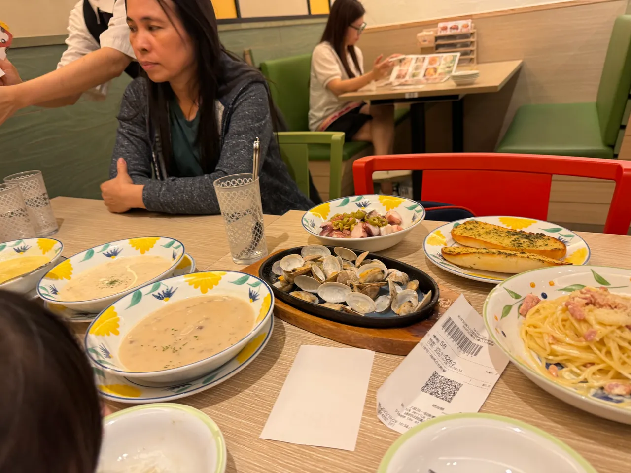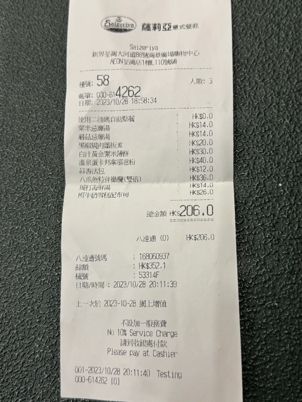 這間餐廳是吃西餐,以Pizza和意粉為主菜的,今天的份量比平常多了一點,這間餐廳的食品不算很精緻,我自己本身不太喜歡,但不知道為什麼大寶很喜愛,看一看桌子上面的食物,你們估計要多少錢呢?給你們一個參考,在Pizza Hut,一個忌廉蘑菇湯的價錢連服務費已經需要四十多元,如果叫同一個份量的話,我估計埋單起碼$6、700。你們能猜到這一頓晚餐是多少嗎?
