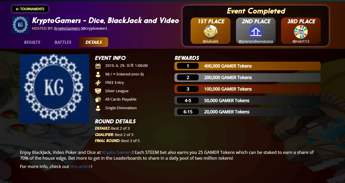 오늘 스몬 토너먼트 참여를 해서 Krypto Gamers Token을 채굴했다.