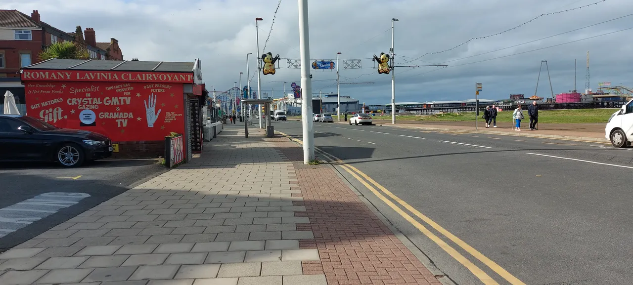 This is the road we're on, we're in between two amusement fairs, some cool shops, and a tram stop is just across the road.
