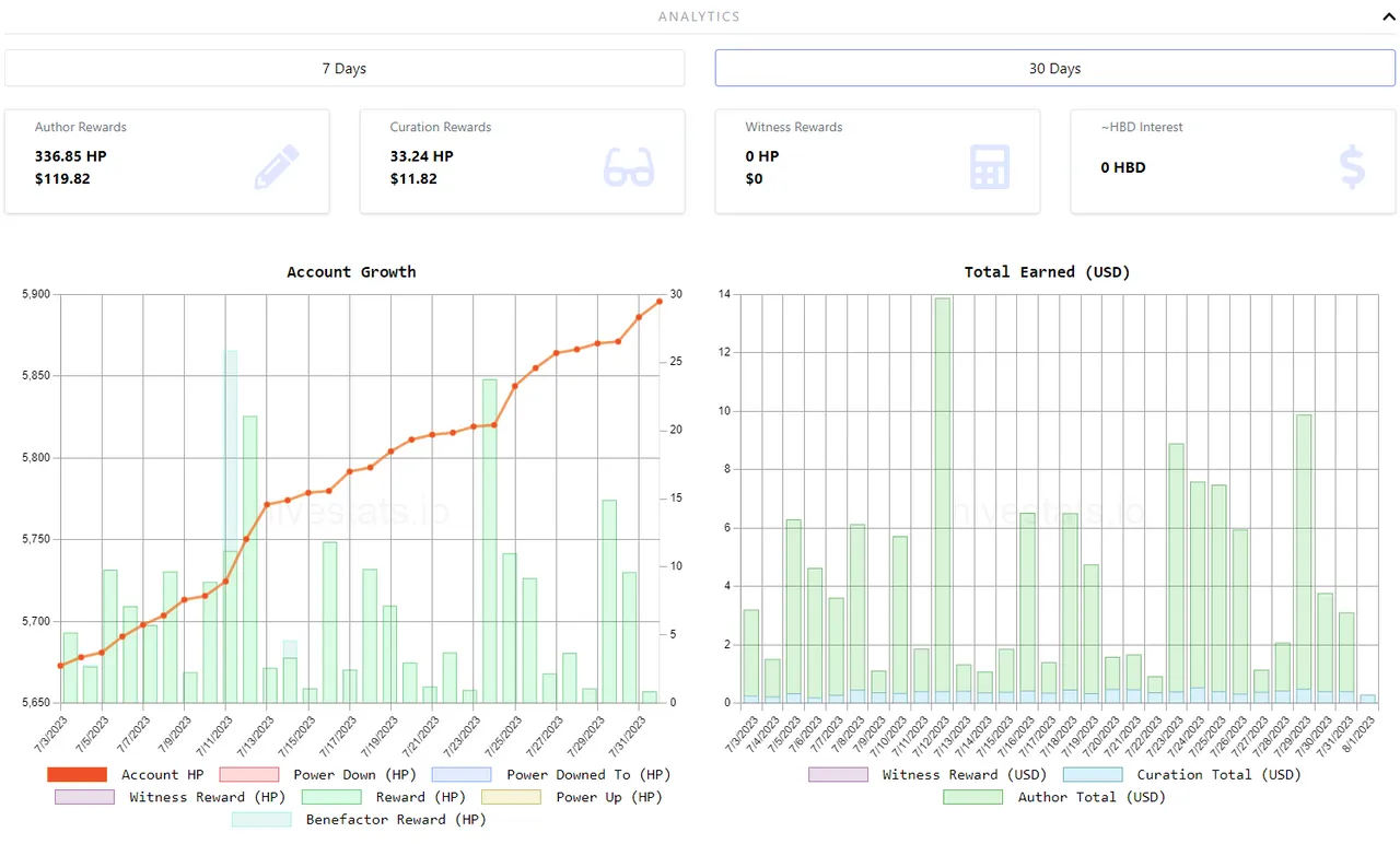 This is a chart showing my earnings over the last 30 days, and I'm really happy to see how much I'm growing each month. Since my big power-up last month, I've really noticed my curation rewards alone helping my account grow, and I think this is a prime example of why it's important to keep your Hive powered up.