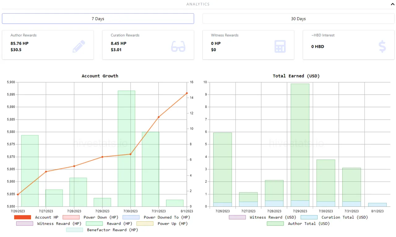 Here's a screenshot from Hivestats.io which shows how I've done in the last 7 days. I'm pretty happy with my earnings and pretty much every bit of HBD I earn either gets converted into HP or spent on coins on Hive Engine.