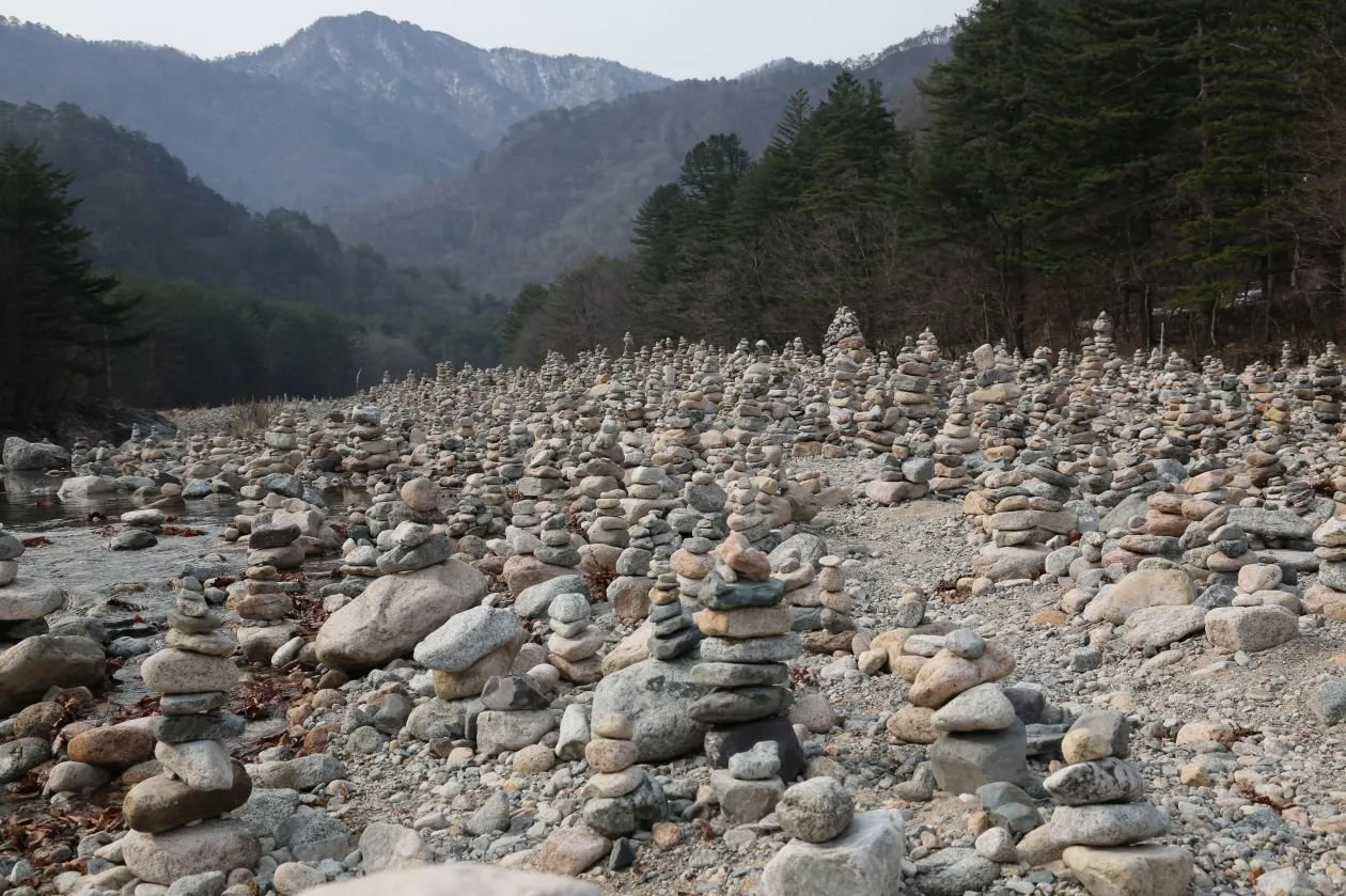 설악산 백담사 수렴동 계곡에서 느낀 내 느낌이다. 백담사를 건너는 다리인 수심교를 지나다 보면 뜻밖의 장관이 펼쳐진다. 수렴동 계곡 따라 사람들이 쌓아놓은 무수한 돌탑들.