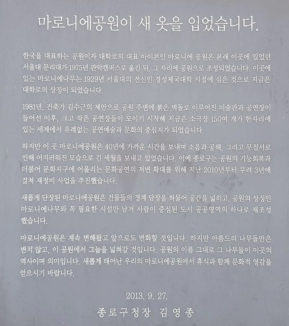 서울대 문리대가 1975년 관악캠퍼스로 옮긴뒤 그자리에 공원으로 조성 되었고, 마로니에 나무는 1929년 서울대의 전신인 경성제국대학 시절에 심은 것으로 지금은 대학로의 상징이 되었고, 2010부터 3년에 결쳐 이곳을 재정비 하였다고 합니다.