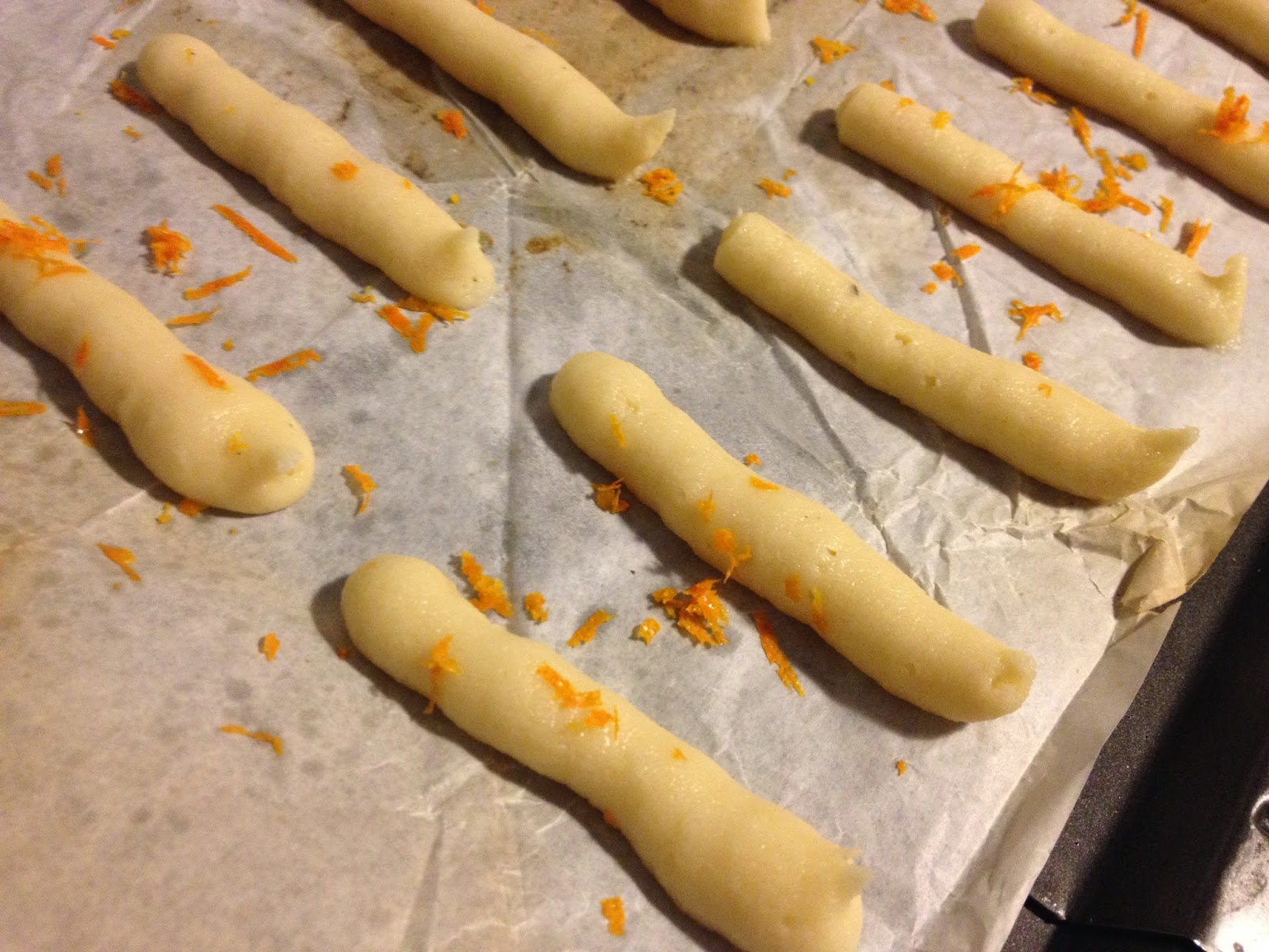 En una bandeja untada con mantequilla vamos echando unas tiras pequeñas con una manga pastelera de un dedo de longitud y dejando separación suficiente entre ellas ya que al calentarse la masa se extiende bastante.
